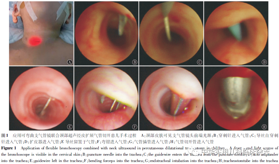 资料与方法1.1 一般资料 回顾性研究。选择2018年12月至2021年5月山东大学附属儿童医院呼吸介入科行支气管镜联合颈部超声PDT的24例患儿为研究对象。其中男12例,女12例,男女比例为1∶1;年龄21 d~2岁,中位年龄5个月;中位体质量5.8 kg。术前均征得患儿监护人同意并签署知情同意书,本研究通过医院医学伦理委员会批准(SDFE-IRB/T-2022017)。1.2 方法1.2.1 物品准备 (1)气管切开套管(以下称气切套管)、导丝、扩皮器、换药包、5.5寸弯蚊式止血钳(以下简称弯钳)、无菌手套、手术衣、无菌纱布、无菌棉球、无囊气管插管(2.5#、3.0#、3.5#)、吸痰管、碘伏、石蜡油;(2)超声仪器:Philips CX50;(3)电子支气管镜:Olympus EVIS LUCERA BF-260系列:BF-XP260F(外径2.8 mm)。1.2.2 人员准备 麻醉医师1 名,手术医师1 名,支气管镜医师1 名,超声医师1名,手术护士1 名。1.2.3 患者准备 全身麻醉后置入喉罩,患者取仰卧位,肩颈部垫高,充分暴露颈前皮肤。1.2.4 超声定位拟穿刺点 常规行颈部超声扫查:清晰显示甲状腺、环状软骨、气管软骨环及颈前组织结构有无异常变异或病变;超声定位甲状腺峡部位置;选择合适穿刺入路并标记穿刺点;超声评估穿刺安全性。定位结束后予常规消毒铺巾。1.2.5 支气管镜引导经皮扩张气管切开 (1)支气管镜经喉罩进入气管,将镜头前端置于气管第二、三软骨环之间,术者可在体表看到光斑(图1A),比较光斑位置与超声定位点的关系,如已达到定位点水平,则进行下一步操作,如未达到定位水平,可将内镜下移至第三、四软骨环之间。最终确定切开点。(2)在最终定位点横向切开皮肤0.5~1.0 cm(具体切开长度与拟置入气切套管直径有关),在支气管镜监视下将穿刺针自气管前壁刺入(图1B),经支气管镜调整刺入的角度及深度。(3)穿刺成功后置入导丝(图1C),使用扩皮器扩张穿刺隧道(图1D),拔出扩皮器,保留导丝(图1E),沿导丝用弯钳逐层钝性分离皮下、肌肉层、气管前壁,注意在支气管镜下监视弯钳头是否已经进入气管(图1F)。(4)弯钳扩张后使用接近套管直径的气管插管沿导丝置入气管(图1G),如能顺利通过,证明已满足置入套管条件,反之则需重复第(3)步操作。(5)将气管切开套管予石蜡油充分润滑,沿导丝旋转置入气管(图1H),注意支气管镜监视,避免将套管置入气管前壁与肌肉之间的夹层,操作过程要轻柔,不可暴力置管,如置入困难,重复(3)、(4)步操作。(6)置管成功后,将麻醉机与气管切开套管连接通气,支气管镜自气管与套管壁间隙进镜,观察套管远端与隆突间的距离,使用绑带固定套管,通过灭菌开口纱布垫入套管与皮肤之间的厚度调整置管深度。