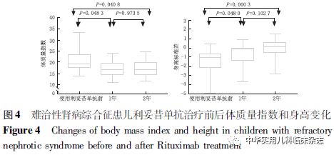 讨论目前有研究[8-9]报道,RTX 治疗后、B细胞恢复时加用MMF进行维持治疗可有效改善尿蛋白复发次数、延长尿蛋白缓解时间,不但很少出现严重不良反应,且MMF治疗可长期耐受。本研究方案所使用的治疗方案为予RTX(每次375 mg/m2,最大剂量每次500 mg,前2剂每周1次,连续2次)治疗,3~6个月逐渐减停激素及CNI,当外周血中 CD19+B淋巴细胞≥1%时追加1剂RTX,每例患儿使用3~4剂,后续使用MMF抑制免疫反应,本研究发现,这种治疗方案可使尿蛋白的无复发率明显升高,即使停用激素和/或免疫抑制剂,复发率也明显下降。同时本研究显示,使用RTX后,由于激素的使用剂量下降,患儿身高及BMI得到明显改善。Iijima等[10]的临床试验显示,每周使用RTX共4次,1年无复发存活率为29%。Tellier等[11]对18例SDNS患儿使用RTX,首次予1~4剂RTX,观察2年,患儿尿蛋白无复发率为22%。本研究治疗方案显示,患儿1年尿蛋白无复发率为85%,2年为40%,这提示本研究方案具有优势性。Fujinaga和Hirano[12]对37例激素依赖型肾病综合征患儿进行单次RTX治疗后,患儿CD19+B淋巴细胞在5个月内开始回升。黄建萍等[13]研究发现,使用RTX后的CD19+B淋巴细胞持续低水平的时间为(6.10±0.92)个月。本研究显示RTX后CD19+B淋巴细胞维持<1%的中位时间为180 d。免疫抑制剂可作为辅助治疗以维持难治性肾病综合征RTX治疗后蛋白尿的缓解。Basu等[14]研究表明,RTX对激素耐药型肾病综合征的疗效还取决于多种因素,即使充分免疫抑制后也可能对治疗结果产生不利影响,这取决于活跃的肾小球数量,B淋巴细胞耗竭或B淋巴细胞恢复并不是维持缓解或复发的唯一标准,MMF的免疫调节在B淋巴细胞恢复后仍有维持缓解的作用。MMF维持治疗可帮助避免重复使用RTX,并可能有助于其更安全的使用。在RTX后使用MMF将治疗失败的风险降低了80%,且耐受性良好[9]。张涛等[15]研究表明,MMF可显著延长尿蛋白持续缓解时间并减少尿蛋白复发次数,并减少严重的RTX相关不良事件。RTX重复给药5次及5次以上的安全性尚待评估,因此不推荐延长重复给药时间,可在B淋巴细胞恢复期间予MMF维持治疗。本研究患儿均未出现严重不良反应,仅有轻度胃肠道异常及过敏反应,及时对症处理后有效控制了症状。虽然其他研究中发现RTX可直接导致IgG水平下降[16-17],但本研究中患儿在2年观察期内未见明显IgG下降,也未显著增加感染的概率。本研究的潜在不足为予3~4次RTX治疗在某些患儿中可能过多。10%~20%的患儿使用1次或2次RTX治疗后,可维持多年的长期缓解[16,18]。Takahashi等[19]研究提示,1年内未复发的患儿可能无需额外使用RTX。然而本研究显示,1年无尿蛋白复发率高达85%,而在使用RTX 2年的观察期内,仅6例(30%)患儿诊断为FRNS/SDNS。因此具体的RTX治疗疗程需增加病例数和延长随访时间进行制定。此外,本研究病例数较少,病理类型FSGS仅1例,只能将FSGS合并到MPGN中与MCD进行比较,后续会增加样本量行进一步统计分析。综上,使用 RTX 在停用激素和其他免疫抑制剂情况下也可有效降低疾病复发率,同时有效促进患儿更好地生长追赶,RTX治疗对复杂性FRNS/SDNS患儿治疗有效且安全。今后有待进一步扩大样本量,延长随访时间,进一步证实影响RTX治疗效果的相关因素。