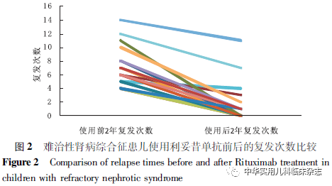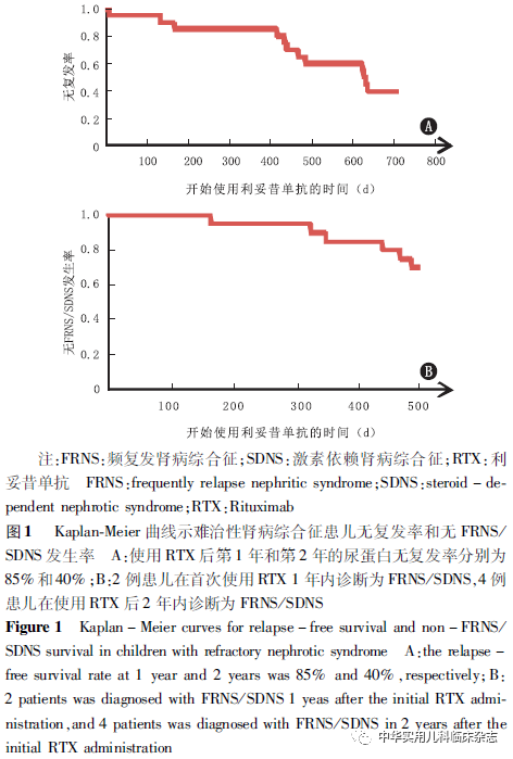目的 评价利妥昔单抗(RTX)在难治性肾病综合征患儿中维持缓解的有效性。方法 回顾性研究。将2018年11月至2020年11月华中科技大学同济医学院附属武汉儿童医院肾内科诊断为难治性肾病综合征的22例患儿纳入研究,予RTX治疗。外周血中 CD19+B淋巴细胞≥1%总淋巴细胞者追加1剂RTX(375 mg/m2),每例患儿使用3~4剂,早期停用钙调神经磷酸酶抑制剂(CNI),后续使用霉酚酸酯治疗。采用Kaplan-Meier法对RTX治疗后患儿的蛋白尿无复发率和无频复发肾病综合征或激素依赖肾病综合征发生率进行分析,采用Wilcoxon秩和检验对使用RTX前后的复发次数进行分析。采用秩和检验对RTX治疗前后患儿的体质量指数(BMI)及身高进行比较。结果 22例患儿中,20例患儿完成治疗方案,1年和2年的蛋白尿无复发生存率分别为85%和40%,CNI停用后复发频率降低。所有患儿BMI及身高在使用RTX治疗前与使用RTX 1年后、2年后比较,差异均有统计学意义(均P<0.05),使用RTX后1、2年比较,差异均无统计学意义(均 P>0.05)。结论 使用 RTX 在停用激素和其他免疫抑制剂情况下也可有效降低难治性肾病综合征的复发率,同时可使患儿BMI及身高得到明显改善。RTX治疗难治性肾病综合征患儿安全有效。