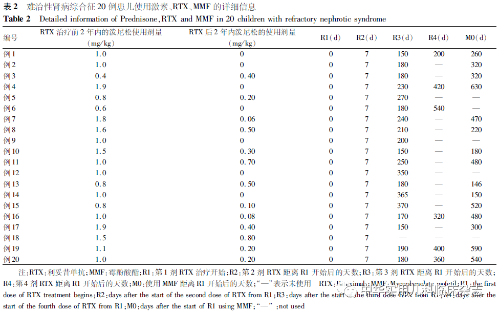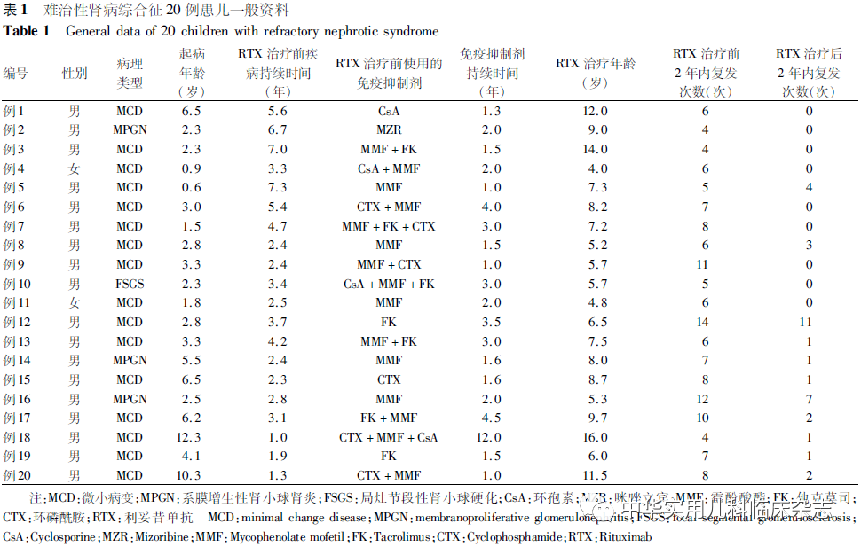 资料与方法1.1 研究对象 回顾性队列研究。选取2018年11月至 2020年11月华中科技大学同济医学院附属武汉儿童医院儿科诊断为复杂性FRNS/SDNS的22例难治性肾病综合征患儿,其中男20例,女2例;年龄(4.02±2.96)岁。22例患儿中,1例患儿监护人拒绝接受随访,1例患儿使用1次RTX后1周内出现复发,监护人要求停用RTX治疗,认为该患儿治疗失败。余20例患儿纳入最终研究。入选标准:(1)患儿在使用RTX前完善肾活检检查(表1);(2)首次使用RTX治疗;(3)RTX治疗前监测CD19+ B淋巴细胞>10%;(4)CD4+ T、CD8+ T淋巴细胞计数>200个/μL;(5)RTX治疗后随访至少24个月。本研究已通过医院医学伦理委员会批准(批准文号:2021R138-F01),患儿监护人均知情同意并签署知情同意书。