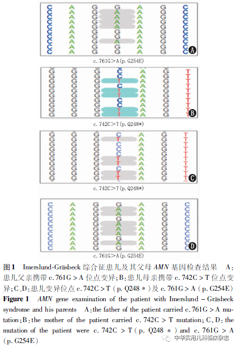 临床资料1.1 一般资料 患儿,男,16岁5个月。因“双下肢无力2周”收入院。患儿表现为突发双下肢无力,行走困难,严重时需扶物支持。病程中无明显共济失调和跌倒,无头晕头痛。既往有巨幼细胞性贫血及孤立性蛋白尿病史。4年前无明显诱因出现双下肢无力,至苏州大学附属儿童医院就诊,诊断“吉兰-巴雷综合征”,予“丙种球蛋白及甲泼尼龙”等治疗后好转出院,2次发病间期可正常行走及活动。患儿系第1胎第1产,足月顺产出生,无窒息抢救史,胎盘及羊水无特殊。出生体质量3 000 g,2个月会抬头,6个月会坐,10个月会站,2岁可独走。家族中有一妹妹,体健。父母非近亲婚配,均体健。否认家族遗传病史及传染病接触史。本次入院体格检查:患儿神志清,精神反应可,无特殊面容,高级神经功能正常,颅神经查体阴性,双上肢肌力5级,双下肢肌力5-级,深浅感觉正常,双侧膝反射未引出,双侧病理征阴性,自主神经系统查体阴性。心、肺、腹未见异常,指、趾无畸形。实验室检查示:血常规:平均红细胞体积(MCV)110 fL,平均红细胞血红蛋白含量(MCH)37.8 pg,平均红细胞血红蛋白浓度(MCHC)342 g/L,网织红细胞百分率7.58%,未成熟网织红细胞百分率35.8%;尿常规:尿蛋白(+++);24 h尿蛋白定量:总蛋白953.4 mg/24 h。血生化:丙氨酸转氨酶88.1 U/L,天冬氨酸转氨酶47.1 U/L。血铅(Pb)、铜蓝蛋白、维生素组套(包括维生素A、B1、B2、B6、B12、C、E,叶酸,25羟维生素)、抗甲状腺球蛋白抗体、脑脊液常规生化、自身免疫性脑炎抗体、吉兰-巴雷综合征相关抗体均未见异常。血尿遗传代谢检测:丙酰基肉碱(C3) 15.95 μmol/L,C3/乙酰基肉碱(C3/C2)0.43,尿甲基丙二酸[50.82 μmol/(mmol·Cr)][0.2~3.6 μmol/(mmol·Cr)]显著升高;血同型半胱氨酸(Hcy) 85.7 μmol/L。肌电图检查:四肢周围神经广泛损伤,下肢周围神经损伤严重,累及运动神经和感觉神经,传导速度及波幅明显下降,双侧肢体神经损害基本对称。其他辅助检查:心电图、超声心动图、常规脑电图、胸部、腹部CT平扫正常。磁共振检查示整个脊柱和附属器信号弥漫性降低(考虑贫血所致)。1.2 基因检测 二代基因测序技术检测结果为AMN基因突变:c.742C > T (p.Q248*)及c.761G>A (p.G254E),为复合杂合突变。变异p.Q248*为无义突变,变异p.G254E为错义突变,上述变异已有文献报道[1,6],计算机辅助分析预测显示上述变异均可能影响蛋白质结构/功能,不属多态性变化,在人群中发生频率极低。该复合杂合变异分别遗传自患儿父母,符合常染色体隐性遗传规律(图1)。结合患儿临床表现和家系分析,该AMN基因复合杂合变异可能是导致患儿发病的致病性变异,提示患儿可能为IGS。