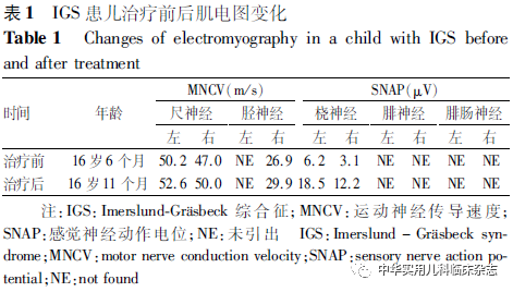 讨论IGS是一种罕见的常染色体隐性疾病,其特征为远端肠选择性维生素B12吸收不良。有时伴蛋白尿,由肾近端小管对低分子量蛋白的再吸收缺陷所致[12]。最初,该病在挪威和芬兰几乎同时被报道。通常IGS在3~10岁的儿童中被诊断为维生素B12缺乏和蛋白尿,而无任何其他临床症状。尽管东地中海国家报道的病例数量不断增加,但在芬兰和挪威仍有明显的丛集分布[13]。IGS临床特点为巨幼细胞性贫血和持续性蛋白尿,通常在婴儿期或幼儿期发病,临床表现包括易疲劳、贫血貌、生长发育迟缓、粒细胞减少、反复感染、胃肠功能紊乱、黄疸、心脏杂音和非特异性蛋白尿等[14]。另外,IGS的症状几乎涵盖了所有的神经功能:痴呆、精神症状、脊髓病变和周围神经病变[6,12]。目前,IGS所致的脊髓病伴周围神经病变报道较多,单纯周围神经病变至今未见报道。本例患儿是我国第3例IGS报道病例,也是首例涉及周围神经系统的病例,本研究丰富了该综合征的临床表型谱。已报道病例并无明显的周围神经损害,可能是其早期诊断后及时治疗,避免了后续周围神经损害的发生。由于IGS在中国非常罕见,本例患儿早期未确诊。由于患儿的巨幼细胞性贫血、蛋白尿和周围神经病变症状,在使用液相色谱-串联质谱法进行检查后,发现本例患儿存在甲基丙二酸血症(MMA),同时伴Hcy升高。然而,MMA通常与严重的认知发育障碍、癫痫等相关。为进行病因诊断,进一步采用高通量测序技术寻找致病基因,结合相关文献再次评估后,最终确诊为IGS。IGS与MMA的临床症状有一定重叠,且均有不同的神经症状,需进行鉴别。另外,可导致维生素B12缺乏的疾病还有内因子缺乏(IFD),主要由GIF基因突变导致。在二代测序推广前,二者临床表现类似,很难区分,可通过补充内因子(IF)行诊断性治疗。因此,IGS与其他疾病的诊断及鉴别诊断仍依赖于基因检测。维生素B12又称钴胺素(Cbl),Cbl从食物摄取到门脉系统的摄取和转运途径:Cbl在唾液和胃酶作用下从食物蛋白中释放出来,然后结合于结合咕啉;在近端肠内,胰腺酶降解结合咕啉,而后Cbl结合于IF;在回肠中,Cbl-IF复合物与cubam受体(AMN、CUBN基因编码)结合并进入回肠上皮。在细胞内部,IF被降解,Cbl进入门静脉系统。cubam受体被回收到细胞膜上。在血液中,转钴胺素2 (TC2)将Cbl运送至组织[6]。AMN基因和CUBN基因分别位于14号染色体和10号染色体,分别编码cubam受体的amnionless亚基和cubilin亚基[6],这两种基因突变将导致该受体功能受损,继而导致维生素B12吸收障碍。故IGS理论上将出现血清维生素B12降低,有限的报道中也支持该现象[5],但本例患儿血清维生素B12水平正常,不排除实验误差所致。关于治疗,维生素B12缺乏首先通过肌注羟钴胺纠正,建议患者终身定期注射[15]。目前有多种报道建议的治疗方案:先肌注羟钴胺1 000 μg/d,持续10 d,之后每个月肌注1 000 μg 1次[16]或每周肌注1 000 μg 1次,持续1个月,然后每3个月或6个月肌注1 000 μg 1次[17]。也有文献报道每隔2周口服1次1 mg维生素B12治疗IGS成功的案例[18]。研究表明,维生素B12亚临床缺乏可能导致动脉粥样硬化、痴呆和骨质疏松症等疾病[19],并认为维生素B12是无毒的,建议患者接受较必需剂量更高剂量的羟钴胺[16]。在本例患儿中,根据患儿临床症状和实验室检查等表现逐渐减少剂量,且每个月肌注1次1 000 μg羟钴胺的长期疗效非常好。本例肌电图显示周围神经损伤严重,经10个月的治疗,患儿症状基本消失,而肌电图的改善是滞后的,所以疗效的评估应以临床表现为主。据报道,维生素B12缺乏引起的周围神经损伤的严重程度与维生素B12缺乏的持续时间有关,其预后与早期治疗密切相关[16]。因此,早期诊断很重要。另外,该病并非自身免疫病,理论上丙种球蛋白的使用无效,本例患儿4年前经丙种球蛋白治疗后,神经系统症状好转,考虑与该病加重-缓解的自然病程有关。综上,AMN基因变异导致的维生素B12吸收障碍引起多系统受累,包括肾脏、神经及血液系统,是一种罕见的常染色体隐性遗传病。该病临床异质性强,但治疗效果好,早期诊断及治疗非常重要。对于运动发育迟缓和间歇性轻度运动障碍伴血液学和肾脏受累的患者,应注意检测维生素B12相关基因,避免长期缺乏带来的不良影响。针对AMN基因等影响维生素B12吸收的基因变异,早期、大剂量羟钴胺治疗可显著改善预后。