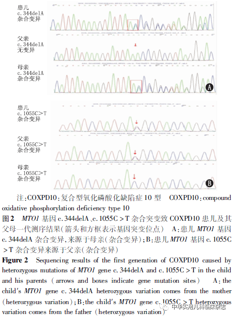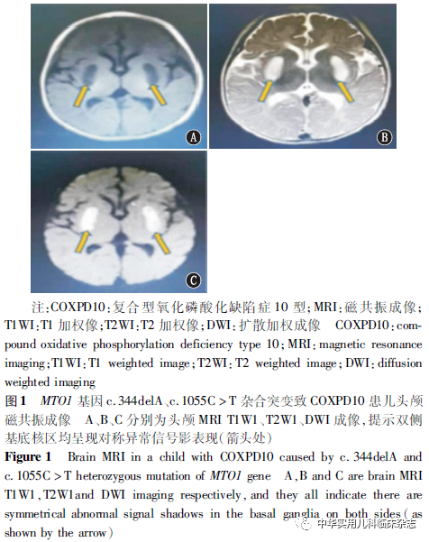 讨论2012年Ghezzi等[6]报道了第1例MTO1基因突变导致的线粒体氧化磷酸化功能障碍,以婴儿期肥厚性心肌病和乳酸酸中毒为特征。随后,有研究证实MTO1基因突变的典型临床表现为乳酸酸中毒、肥厚性心肌病、不同程度智力和运动障碍[6-7,9]。MTO1基因缺失的斑马鱼和小鼠模型也显示了与人类相同的表型特征[10-11]。本例患儿出生早期即表现无明显诱因的反复呼吸急促,虽血液学检测提示血糖正常,但血气显示代谢性酸中毒,且血乳酸和血氨明显升高,符合本病表现。但本例患儿心肌酶学、心电图、心脏彩超均无异常,其原因一方面可能与肥厚型心肌病在年长儿表现更为明显有关[7],本例患儿目前仅6个月,可能在心肌肥厚上表现尚不明显。另一方面也是更为重要的原因,MTO1基因突变是一个表现谱广泛的疾病,不同的基因突变位点临床表现有所差异。对35例MTO1基因突变的病例分析显示,其中6例未发生肥厚型心肌病,有1例甚至在22岁时仍无肥厚型心肌病[7]。究其原因,本例患儿MTO1基因2个突变位点c.344delA、c.1055C>T均与已报道的突变位点不一致,可能是其无心肌肥厚表型的重要原因。另本例患儿就诊时无生长发育落后,无听力损害和抽搐,脑电图也无癫痫波,但头颅MRI已出现明显脑损害。这揭示脑部器质性损害是明显早于临床表现的,提示在临床工作中,对该类患儿在症状出现前就应加强对重要脏器形态和功能监测。总之,由MTO1基因突变引起的COXPD10是一种进行性发展且累及多个系统的疾病,在临床中,对无明显诱因高乳酸血症伴或不伴多系统损害的患儿应注意早期检查明确有无该类疾病存在的可能,以减少漏诊和误诊。线粒体生物标志物检测、影像学及肌肉呼吸链酶分析均有助于本病诊断。如血、尿和脑脊液中乳酸、血氨升高需高度怀疑线粒体功能障碍。头颅MRI显示病变在T1WI呈低信号,T2WI、FLAIR序列和DWI呈高信号高度提示线粒体脑病[12]。肌肉呼吸链酶分析往往可发现单种或多种呼吸链酶缺乏[13]。但这些检查都不具特异性。诊断的金标准为全外显子基因检测而不是单个基因测序。本例患儿外周血全外显子基因测序发现MTO1基因c.344delA和c.1055C>T杂合突变。虽在目前基因数据库和文献报道中均无该位点的信息[7],但基因和蛋白质分析软件均提示这2个位点可能导致基因功能缺失,为有害的杂合突变。而且结合患儿临床表现为持续高乳酸血症,进展性运动发育迟缓,线粒体脑病的头颅MRI影像学改变,因此可高度相信MTO1基因上c.344del和c.1055C>T杂合突变是导致本例汉族患儿COXPD10的原因,该位点的发现也扩增了MTO1基因突变致COXPD10的基因谱。目前尚缺乏针对MTO1基因突变致氧化磷酸化障碍的特异治疗。临床以延缓进展、控制症状为主。多种抗氧化及改善线粒体代谢的药物如左卡尼汀、辅酶Q10,二氯醋酸(DCA)和维生素E用于该病治疗。在某些个案治疗中,观察到DCA可改善乳酸水平,并因此使得肥厚性心肌病及智力障碍得到改善[6]。然而有研究发现,DCA虽可控制乳酸进展,但对癫痫发作及神经系统结局无改善[14]。生酮饮食能改善线粒体的氧化应激状态,通过线粒体呼吸作用促进线粒体能量代谢以产生更多的三磷酸腺苷,减轻线粒体功能障碍[15]。合适的生酮饮食用于高乳酸血症尤其是伴频繁惊厥者,可改善乳酸水平,减少惊厥发作[5]。本例患儿生酮饮食后,于出院后4个月内乳酸水平无进行性进展,保持在10 mmol/L左右。但生酮饮食由于蛋白质和碳水化合物含量低,在儿童使用时尤其应注意生长发育的监测,最好是在营养师指导下进行。研究发现,尼克酰胺腺嘌呤二核苷酸(NAD)调节剂KL1333有助于线粒体生成和功能改善[16],N-乙酰半胱氨酸的补充有益于MTO1基因缺乏患者成纤维细胞中线粒体的翻译[17],这些可能是未来的潜在治疗方向。对引起明显临床症状的高乳酸血症和高氨血症,血液净化是一种有效、迅速维持体内代谢平衡的方式。另外,在该类患者中应避免使用影响线粒体代谢的药物,如利奈唑胺、丙戊酸钠止惊类药物、氨基糖肽类药物等。总之,MTO1基因新发c.344delA和c.1055C>T杂合突变可导致线粒体氧化磷酸化功能障碍,本病临床以高乳酸、高氨血症为特点,心肌肥厚不明显而脑部损害重,治疗无特异,治疗以抗氧化及改善线粒体代谢的饮食和药物为主,注意优生优育是预防本病的根本措施。