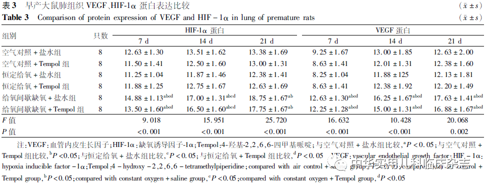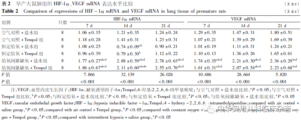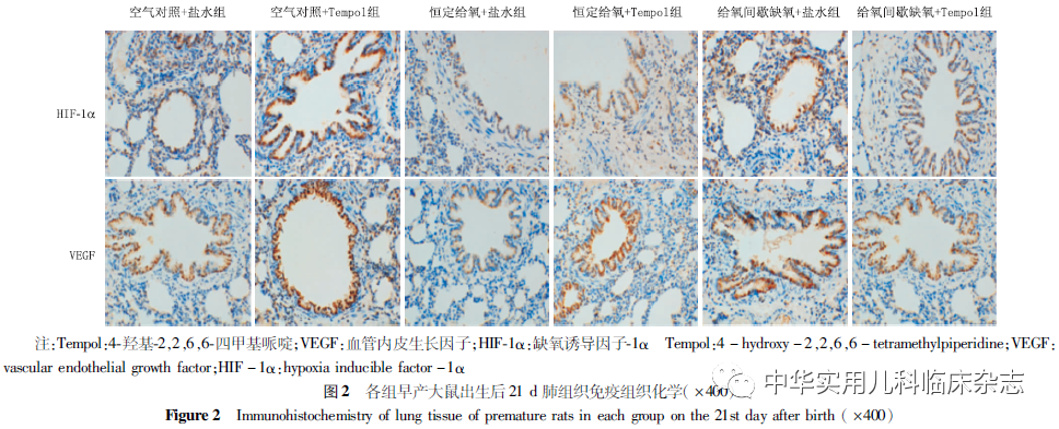 材料与方法1.1 材料 无特定病原体孕15 d SD大鼠购自长沙天勤生物科技有限公司,动物许可证号:scxk(湘)2014-0010。anti-VEGF、anti-HIF-1α、二抗山羊抗兔IgG购自英国Abcam公司;Tempol购自美国selleckchem公司;丙二醛(MDA)检测试剂盒、总抗氧化能力(TAOC)试剂盒购自南京建成生物工程研究所。1.2 方法1.2.1 实验分组及动物模型的建立 孕15 d SD大鼠12只,适应性饲养。于孕21 d,每2 h密切观察,如活动减少,腹部不对称隆起等,估计胎鼠入盆临产行剖宫产[9]。存活的192只早产大鼠按照随机数字表法分为6组:空气对照+盐水组、空气对照+Tempol组、恒定给氧+盐水组、恒定给氧+Tempol组、给氧间歇缺氧+盐水组、给氧间歇缺氧+Tempol组,每组32只。于出生第1、2、3天予Tempol(100 mg/kg)或等量9 g/L盐水腹腔注射[10]。给氧间歇缺氧模型建立[11]:将近期分娩代乳鼠及早产鼠置有机玻璃箱内,内置钠石灰及无水氯化钙吸收二氧化碳(CO2)及水分。向箱内通入氧气或氮气,使舱内氧体积分数维持在(300±10) mL/L,后下降至(100±10) mL/L,维持2 min后再升至(300±10) mL/L,10 min后降至(100±10) mL/L,如此循环3次,每6 h循环3次,每0.5 h测量箱内氧体积分数1次。恒定给氧组300 mL/L持续给氧。早产大鼠给氧治疗14 d后,置常温常压空气中至21 d。定时互换各组间的代乳鼠。1.2.2 标本收集与处理 各组于出生7、14、21 d各取8只早产鼠称重后麻醉,放血处死,取左肺行HE染色、免疫组织化学测定,右肺行HIF-1α、VEGF mRNA表达检测。1.2.3 MDA、TAOC测定 采用化学分析法分别检测肺组织中MDA及TAOC。1.2.4 实时荧光定量PCR(qPCR)检测肺组织HIF-1α、VEGF mRNA 表达 Trizol提取肺组织总RNA。反转录后,行qPCR检测。引物(南京金斯瑞生物科技有限公司):VEGF引物分别为5′-TGTGAGCCTTGTTCAGAGCG-3′和5′-GACGGTGACGATGGTGGTGT-3′。HIF-1α引物分别为5′-TGCTTGGTGCTGATTTGTGA-3′和5′-GGTCAGATGATCAGAGTCCA-3′。β-actin引物分别为5′-CGTTGACATCCGTAAAGACCTC-3′和5′-TAGGAGCCA-GGGCAGTAATCT-3′。1.2.5 免疫组织化学方法检测肺组织HIF-1α、VEGF蛋白表达 切片抗原修复,过氧化氢灭活内源性酶,加HIF-1α、VEGF兔抗大鼠IgG,4 ℃孵育,滴加生物素标记的山羊抗兔IgG,37 ℃孵育30 min,二氨基联苯胺显色,复染,封片,镜下观察。HIF-1α结果判定:胞质内有棕黄色细颗粒沉着为阳性细胞;VEGF结果判定:胞质中有棕黄色颗粒沉着为阳性细胞。蛋白表达的半定量分析:每个标本随机抽取1张切片,每组共8张,计算每高倍镜视野下100个细胞中的阳性细胞数,取平均值。1.2.6 肺功能检测 于出生后21 d,另取各组早产大鼠8只,麻醉后切开气管,插管,连接BuxCo小动物肺功能实验平台系统,检测早产大鼠的潮气量(TV)、每分钟呼吸通气量(MV)、最大呼气流量(PIF)及动态肺顺应性(Cdyn)等指标,了解早产大鼠在其呼吸过程中肺弹性所发生的变化。1.3 统计学处理 采用SPSS 20.0软件进行统计学分析,计量资料以x̄±s表示,多组比较采用单因素方差分析,两两比较采用SNK-q检验。P<0.05为差异有统计学意义。