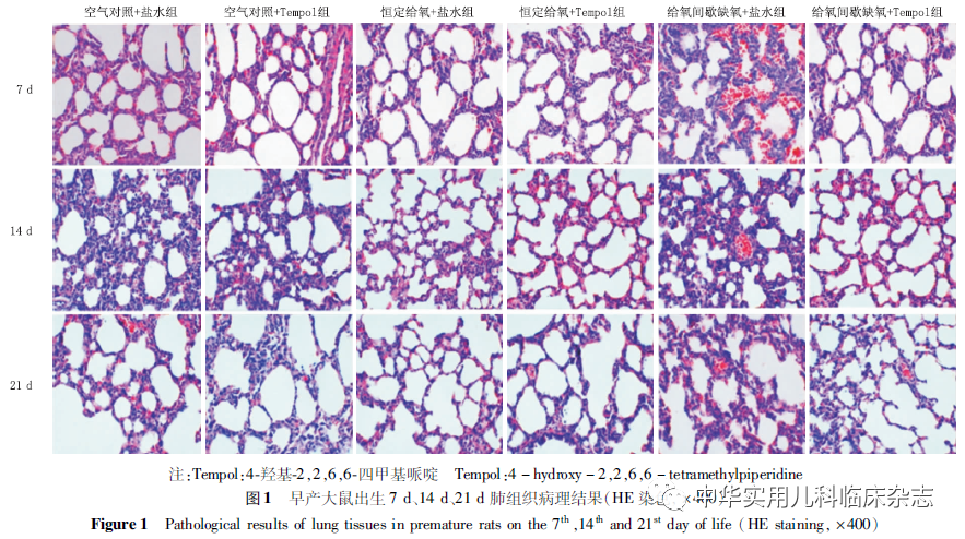 结果2.1 各组早产大鼠肺组织病理学改变 随日龄增加,各组大鼠肺组织终末气腔变小,数量增多,进行性肺泡化。恒定给氧组肺泡结构清晰,大小较均一,肺泡间隔正常,无液体和炎症渗出;空气对照组可见轻度肺间隔增厚;给氧间歇缺氧组肺间隔增厚稍明显,肺泡腔内可见少许红细胞渗出,肺泡结构稍紊乱。给氧间歇缺氧+Tempol组较相应盐水组肺间隔增厚减轻,肺泡腔内红细胞渗出减少(图1)。