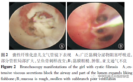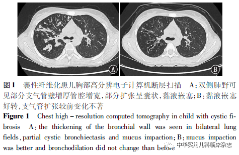 临床资料回顾性个案研究。患儿,女,10岁,因“间断咳嗽、咯黄痰4年余,呕吐、食欲差1周”于2018年6月第1次收入首都医科大学附属北京儿童医院呼吸科病房。入院前4年余,患儿无明显诱因出现咳嗽,咯黄痰,晨起为著,伴发热,平均1次/月,冬季为著,偶有活动受限及喘憋症状,无咯血,无腹泻、腹痛,无流涕、鼻塞、嗅觉障碍,无耳鸣、耳痛及听力减退,排汗正常,就诊于当地医院予抗感染及对症治疗可好转,停药后症状逐渐加重。入院前1年余,患儿咳嗽、咯痰症状加重,严重时夜间难以平卧。于外院检查血总免疫球蛋白E(IgE) 1.7 IU/L,烟曲霉特异性IgE 32.3 KUA/L(4级),肺部CT提示支气管扩张,在其他医院共住院治疗3次,住院治疗期间多次痰培养铜绿假单胞菌、白假丝酵母菌阳性,支气管肺泡灌洗液半乳糖甘露醇聚糖抗原检测阳性,血清总IgE波动于0.8~3.3 IU/L,先后予伏立康唑、头孢哌酮舒巴坦钠抗感染,醋酸泼尼松抗炎及妥布霉素雾化等治疗后呼吸道症状可减轻。入院前1周,患儿出现呕吐,伴食欲下降,无腹痛、腹泻等症状,咳嗽、咯痰同前,伴反复喘息,当地医院行腹部超声检查示胆囊壁粗糙,余未见异常,为进一步诊治收住首都医科大学附属北京儿童医院。自发病以来,患儿呼吸道感染时常伴活动耐力下降,影响正常学习及生活,食欲较差,大小便正常。患儿为足月剖宫产出生,新生儿期健康,生长发育同健康同龄儿,无“脂肪泻”病史。患儿父母体健,非近亲结婚,有妹妹及弟弟各1位,均体健,家族无类似疾病者。入院查体:身高152 cm(位于同年龄同性别儿童第75至90百分位),体质量38 kg(位于同年龄同性别儿童第50至75百分位),体质量指数为16.4。体温37.2 ℃,脉搏100次/min,呼吸24次/min,血压90/60 mmHg(1 mmHg=0.133 kPa),双侧副鼻窦区压痛阳性,呼吸稍促,可见轻度吸气性三凹征,双肺呼吸音粗,可闻及少许痰鸣音及细湿啰音,无哮鸣音,心、腹及神经系统查体未见异常。杵状指(趾)阳性。辅助检查:多次痰培养及支气管肺泡灌洗液培养铜绿假单胞菌阳性,半乳糖甘露醇聚糖抗原检测阳性,呼吸道病毒抗原检测、结核菌素试验阴性。血IgE 1.2 IU/L(正常值≤0.2 IU/L),脂肪酶200.7 U/L(正常值 0~39.0 U/L),淀粉酶138 U/L(正常值0~125 U/L),嗜酸性粒细胞计数700×106/L[正常值(50~500)×106/L],烟曲霉特异性IgE 36.1 KUA/L(4级,正常值0~0.1 KUA/L),汗氯试验示Cl-浓度为104 mmol/L(正常参考值<60 mmol/L)。腹部超声、心脏彩超及心电图未见明显异常。肺功能检查示用力肺活量(FVC)为 96.8%,第1秒用力呼气容积(FEV1)为87.6%,FEV1/FVC为77.2%,呼气流量峰值(PEF)为88.7%,25%用力呼气流量(FEF25)为85.7%,FEF50 为60.9%,FEF75 为38.7%,提示小呼吸道功能减低。肺部高分辨率CT(HRCT)示两肺间质炎症并支气管炎,部分支气管壁增厚,管腔增宽,部分呈囊状扩张,黏液嵌塞,右肺为著(图1A)。鼻窦HRCT示双侧上颌窦、筛窦、额窦及蝶窦黏膜明显增厚。全外显子基因测序示囊性纤维化跨膜调节因子(CFTR)基因复合杂合突变(c.293A>G,c.3068T>G)。