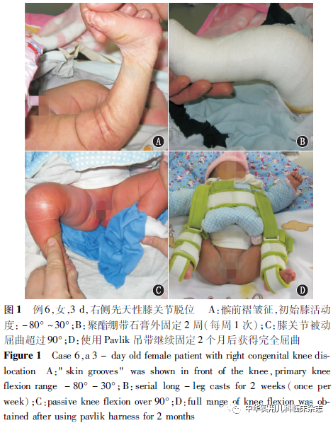 结果2.1 CDK治疗结果 3例(4膝)患儿直接应用Pavlik吊带固定1.5~2.0个月,9例(9膝)患儿经过1~8次(平均2.9次)石膏固定后行Pavlik吊带固定1.5~2.0个月,治疗过程中未发现石膏及Pavlik吊带并发症。12例患儿随访12.0~65.0个月(平均29.8个月),10例11膝治疗评价为优,2例(2膝)患儿(例4、7)末次随访患膝屈曲轻度受限(0°~130°),膝关节稳定性良好,治疗评价结果为良。图1显示典型病例(例6),初始膝活动度-80°~30°,予每周1次石膏纠正,2周后膝关节被动屈曲超过90°,此时应用Pavlik吊带继续固定2个月膝关节屈曲恢复正常,随访29个月,患儿膝关节稳定,行走无疼痛,评价结果为优。