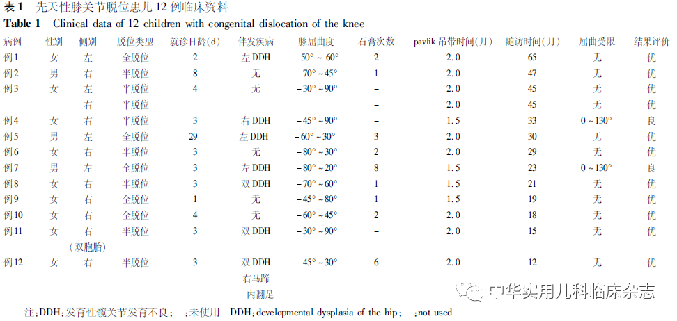 资料与方法1.1 研究对象 回顾性研究。自2011年12月至2019年1月山东第一医科大学附属省立医院小儿骨科共收治CDK患儿12例(13膝),其中男3例,女9例,男女比例为1∶3;单侧11例,双侧1例;初次就诊中位年龄3 d(1~29 d)。出生后被发现单侧或双侧膝关节过伸>20°,患膝上方可见横行皮肤褶皱,部分可扪及髌骨外侧移位,侧位X线显示相对股骨远端,胫骨近端向前方移位,根据两关节面对合情况,将其分为先天性膝关节过伸、半脱位及全脱位,本组中半脱位7例(8膝),全脱位5例(5膝),其中6例伴发育性髋关节发育不良(DDH),1例伴双侧DDH及右侧马蹄内翻足。所有患儿无CDK家族史,均为足月产,其中臀位产者2 例(患儿4、12),1例为双胞胎中第1产(患儿11),无羊水异常者(表1)。本研究通过山东第一医科大学附属人民医院医学伦理委员会批准(批准文号:2022LW-16),患儿监护人对所做研究均知情同意并签署知情同意书。