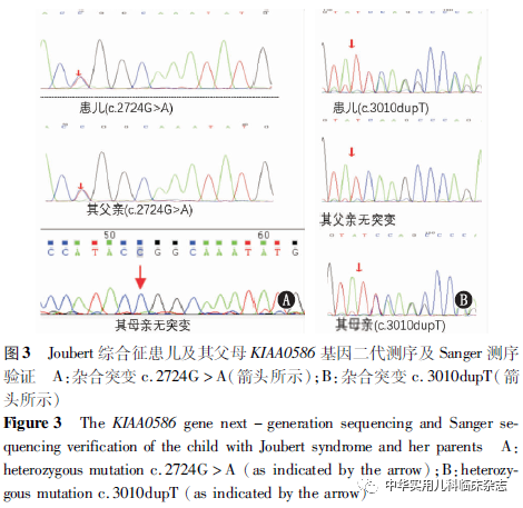 讨论JBTS是一种罕见的神经系统发育障碍性疾病,呈常染色体隐性或X连锁遗传的纤毛疾病。其发病率估计为1/10万~1/8万。随着人们对于这种疾病的认识加深,诊断率提高,报道的发病率也有所上升[3]。国内目前已报道的共有104例,除去4例未知性别的报道,其男女比例为1.8∶1[4-5],与Maria等[6]报道的3∶2 基本相符。典型表现包括新生儿呼吸异常、低眼压、认知障碍、小脑性共济失调以及复杂的中脑和后脑畸形。在颅脑MRI可见“臼齿征”,这是JBTS最易识别的特征及诊断标志。JBTS最早出现的症状一般为新生儿期的呼吸节律异常,易误诊为肺炎。而在婴儿期则会表现出反复呼吸急促,肌张力低下,共济失调,发育迟缓。随着年龄的增长,呼吸症状多有改善,而发育落后则会持续。作为一个连续的疾病谱系,其他的器官障碍可在后续发生,且表现轻重不一,例如肝纤维化、肾囊性病变都可在青少年期出现,并持续进展,最终导致死亡[3]。尽管大多数病例的呼吸系统表现随着年龄的增长逐渐好转,但呼吸衰竭仍是主要死因[7],部分病例可能猝死[8]。KIAA0586基因突变引起的JBTS是该疾病谱中最轻微的,主要累及神经系统[9]。JBTS主要影像学表现包括“臼齿征”、中线裂征、蝙蝠翼状四脑室。其中“臼齿征”最显著,最早可在23周的胎儿脑部影像中被识别[10]。其他的相关畸形还包括海马旋转不良、胼胝体发育异常、枕部脑膨出等,而在1篇JBTS 23型报道中,还见到了异位的神经垂体[8]。国内有表型的99例先证者中(排除5例胎儿),73例有呼吸节律异常,多表现为呼吸急促、喘息,亦有呼吸暂停。肌张力异常的有86例,其中81例表现为肌张力低下,5例表现为肌张力升高。除去自动放弃的2例新生儿,其余97例先证者均有不同程度发育迟缓。其他系统受累的患儿不足1/3[4-5]。JBTS现行的诊断标准包括:(1)小脑蚓部缺如或发育不良;(2)智力损害或智力发育迟缓;(3)肌张力低或共济失调;(4)异常呼吸运动或异常眼运动[11]。由于新生儿期的呼吸异常,在新生儿期应与新生儿肺炎及缺氧缺血性脑病进行鉴别,这2种疾病较少出现动眼障碍,且较少出现呼吸急促与暂停交替[12]。相关患儿易反复呼吸道感染,应与免疫缺陷相关的疾病进行鉴别,可完善免疫功能相关检验及基因检测进行排除。而多系统病变亦应该排除染色体及微阵列变异的疾病,可以通过染色体核型分析及微阵列检测进行排除。本例患儿出现反复呼吸道感染、中耳炎及鼻窦炎,应注意与纤毛不动综合征进行鉴别,可采取纤毛活检进行进一步诊断。JBTS目前已有37种相关基因,除OFD1为X染色体连锁遗传,其余均为常染色体隐性遗传。大样本研究表明[13],C5orf42在该群体中为最主要的致病基因,其次为CC2D2A、AHll、CEP290和TMEM67。通过万方、知网及PubMed进行文献检索,对我国目前见报道的54例相关基因(包括本例)进行总结,已有18种相关基因,在我国最常见的变异基因为C5orf42,其次为CC2D2A、AHI1、CEP290。KIAA0586为本研究首次报道,为国内发现的第18种。先证者复合杂合中遗传自父亲的突变为同义突变,与常规所认为的同义突变不致病有所出入。而研究表明,同义突变可以影响转录效率、基因转录的剪接,进而影响蛋白质的功能及丰度[14],随着临床上对于致病基因的认识加深,有害的同义突变也逐渐被报道。dbDSM数据库是第一个收录了有害同义突变的数据库,目前已收录2 724个有害的同义突变,包括KIAA0586的3个有害的同义突变:c.3303G>A、c.1815G>A及c.990C>T。目前对于同义突变致病性主要依靠相关的计算机预测软件来评估。利用Trap-socre对于先证者的同义突变进行预测,得到的分数为0.9,表明其有害的概率为90.0%~99.9%。现存的多中心诊疗建议对治疗提供了指导[11],但尚未有治愈及逆转病程的方法,多是针对性的专科支持治疗及康复治疗。对于共有的发育落后,积极的康复和及时的评估是有益的。而对于患儿的精神心理异常也应及时评估干预。对于相关的眼部异常,应定期随访监测,避免视力损失。对于呼吸功能,随着年龄的增长,呼吸异常会逐渐改善,但儿童期反复呼吸道感染的风险相对较高。且由于肌张力问题,可能病程更长,规范的治疗随访是必要的,本例先证者由于不规律的治疗发展成为支气管扩张,且有中度睡眠阻塞。对于心、肝肾、骨骼、视网膜等其他系统的问题都应该进行专科随访和干预。但相对来讲,JBTS预后较差。因此,产前诊断对于预防JBTS患儿的出生很重要。产前超声中胎儿小脑蛭部发育不全对于JBTS有提示意义,对于有家族史的胎儿,几乎是有诊断意义的[15]。基因咨询可以帮助已经有相关先证者的家庭。此外,不应轻易剔除同义突变,应仔细比对临床表型与基因型,对于提高遗传性疾病的确诊率以及正确的诊断率将大有裨益。综上,对于出生时有呼吸异常合并婴儿期肌张力低下的患儿,应该考虑到JBTS的可能,及早的干预介入和评估,对于JBTS在于发育方面的提高,以及延缓器官功能损害的进展方面是有积极意义的。