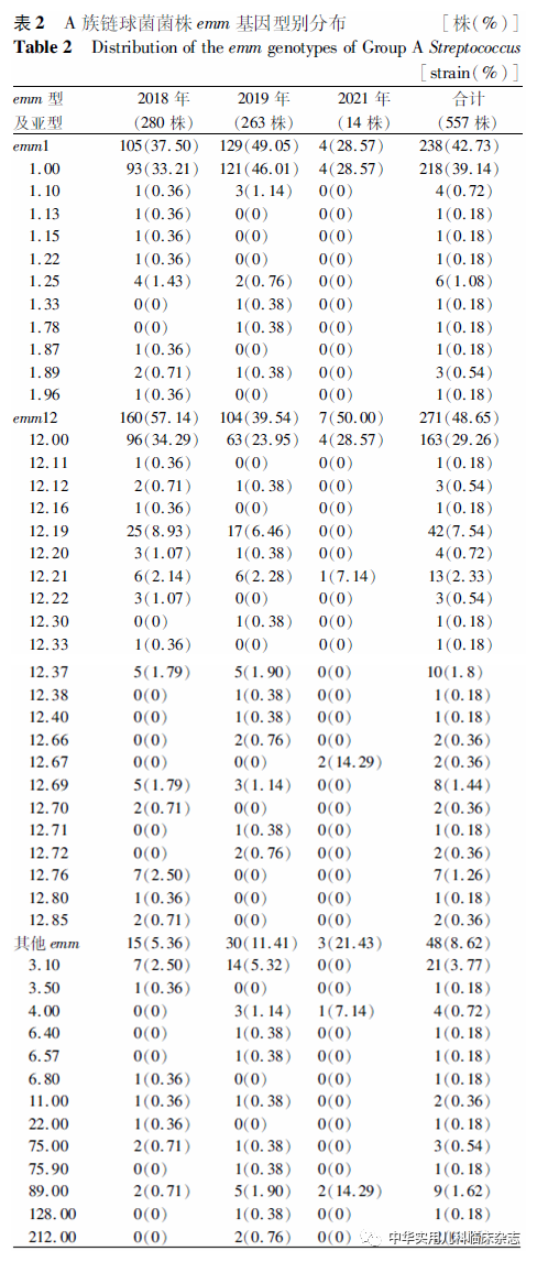 资料与方法1.1 菌株来源 按照北京市猩红热病原学监测方案,采集2018、2019、2021年5月至7月北京市16区辖区内16家猩红热病原学监测哨点医院(1家/区)临床诊断猩红热(疑似/临床诊断/实验室确诊)及咽部感染(链球菌感染/扁桃体炎/咽峡炎)儿童病例咽拭子分离GAS菌株(2020年因新冠疫情原因未开展猩红热监测工作)。1.2 试剂及仪器 哥伦比亚血平板链球菌 A~F 分群鉴定试剂盒购自英国 Oxoid 公司,VITEK-2 全自动微生物分析系统、革兰阳性菌生化鉴定卡购自法国生物梅里埃公司;96 孔革兰阳性需氧菌微量肉汤稀释法药敏检测板购自上海星佰生物技术有限公司;PCR扩增用Taq酶、dNTP购自大连宝生物工程有限公司,DNA提取试剂购自上海之江生物科技股份有限公司。1.3 方法 1.3.1 菌株分离与鉴定 采集病例咽拭子标本,12 h内接种于哥伦比亚血琼脂平板,划线分离,37 ℃、50 mL/L二氧化碳培养箱中培养12~14 h,挑取β型溶血可疑单个菌落,分纯培养后革兰染色,革兰阳性链状球菌经GP生化鉴定卡、VETEK-2全自动微生物分析系统鉴定。用链球菌A~F血清分群试剂鉴定为A群。1.3.2 emm基因型别测定 根据美国疾病预防控制中心方法进行(https://www.cdc.gov/streplab/groupa-strep/emm-typing-protocol.html)。扩增引物1:5′-TATT(C/G)GCTTAGAAAATTAA-3′、扩增引物2:5′-GCAAGTTCTTCAGCTTGTTT-3′、测序引物:5′-TATTCGCTTAGAAAATTAAAAACAGG-3′。PCR扩增体系为Buffer 5 μL,dNTP 1.5 μL,引物1 0.5 μL,引物2 0.5 μL,Taq酶 0.5 μL,H2O 37 μL,模板DNA 5 μL,反应条件95 ℃ 5 min,95 ℃ 20 s、50 ℃ 45 s、72 ℃ 90 s,循环30次,72 ℃ 5 min。PCR扩增产物委托上海英潍捷基生物技术有限公司进行纯化和基因序列测定。序列提交美国疾病预防控制中心网站(https://www2a.cdc.gov/vaccines/biotech/strepblast.asp),比对获得emm基因型及亚型。1.3.3 抗生素敏感性试验 挑取适量新鲜GAS分纯菌落数个,置2~3 mL灭菌9 g/L盐水中,配制0.5麦氏单位的菌悬液,取60 μL该菌悬液和600 μL无菌马血清,加入到12 mL营养肉汤培养液中混匀。吸取该稀释菌液各100 μL,加入96孔革兰阳性需氧菌药敏检测板,此药敏板包含10种抗生素(左氧氟沙星、青霉素、美罗培南、利奈唑胺、红霉素、克林霉素、万古霉素、四环素、头孢噻肟、头孢吡肟),每次实验设立阴、阳性对照,具体操作步骤及最低抑菌浓度(MIC)结果判定方法见96孔革兰阳性需氧菌微量肉汤稀释法药敏检测板试剂盒说明书,根据美国临床实验室标准化委员会(CLSI)颁布的M100-S26标准[6]获得相应敏感(S)、中介(I)和耐药(R)结果,计算MIC50和MIC90。1.4 统计学处理 采用SPSS 22.0软件进行统计分析,WPS表格软件绘制图表。数据采用株(%)描述,应用χ2检验和Fisher′s确切概率法进行组间比较,P<0.05为差异有统计学意义。