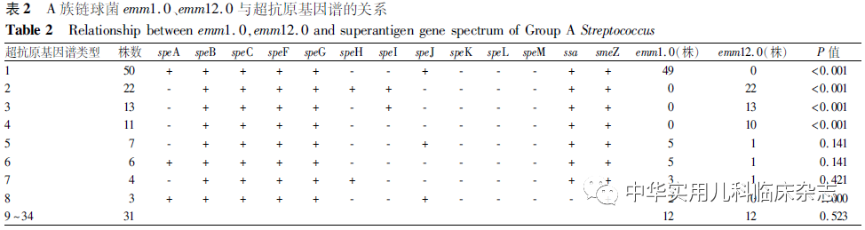 讨论GAS是儿童和青少年人群常见的致病菌,致病谱广,感染后临床表现形式多样,是造成全球儿童死亡的十大感染性疾病病原之一[5]。猩红热样红斑由于其临床症状不典型而未引起足够重视,成为潜在传染源,加重GAS的传播。本研究中猩红热样红斑患儿的发病年龄多数为 3~12岁,与既往研究报道一致[6];男童发病人数显著高于女童。Liu等[7]研究发现,男童感染GAS的风险高于女童,推测可能与男童比女童有更多的密切交流和较差的卫生习惯有关。emm分型是GAS流行病学监测的重要内容,其分布因监测地区及时节、菌株来源等不同而有所差异。本研究结果发现,北京地区猩红热样红斑患儿GAS的emm分型以emm1.0为主,其次为emm12.0。吴双胜等[8]对北京地区猩红热的GAS研究发现以emm12.0为主,其次为emm1.0,本研究结果与之不同。2011年至2018年国家疾病预防控制中心数据显示,emm12.0型是我国猩红热流行的主要型别,emm1.0次之。本研究中emm1.0型的比例为51.70%,emm12.0的比例为40.82%,emm1.0超过了emm12.0成为主导基因型。彭晓旻等[9]研究发现,2011年至2014年北京儿童猩红热主导基因型由emm12.0逐渐向emm1.0转换,我国台湾地区Chiou等[10]学者及天津阴杰莹等[11] 学者也有emm基因型转换的报道。You等[12]报道2011年至2018年北京地区GAS中emm分型的变化情况,emm12.0分型下降,emm1.0逐渐上升,需要更多关注由emm1.0型GAS引起的猩红热。在中国(上海、香港)及英国也有emm1.0型GAS引起的猩红热增长的报道[13-15]。对于emm1.0分型逐渐增高并超过emm12.0的原因,可能为既往emm12.0作为主导菌株流行时,人群对此型别的免疫力逐渐增加,形成对emm12.0群体免疫,而对于emm1.0型易感人群增加,emm1.0型逐渐成为主导基因型。Jaggi 等[16]研究发现,儿童中emm分型与年龄分布有关,在3~6岁emm12.0型的检出率高,emm1.0型的检出率与年龄无相关性。对于emm主导基因型转换的周期及原因还需要进一步研究。此外,本研究发现emm1.0和emm12.0的SAgs基因谱存在较大差异,2种菌株的毒力差异是否与流行病学变化有关也值得深入研究。本研究对13种毒力基因的检出率及共现性进行评估,发现在emm1.0和emm12.0基因分型中,speB、speC、speF、speG、ssa和smeZ的检出率均较高,在2种基因型中检出率无显著差异;speA和speJ在emm1.0型中检出率高,speH和speI在emm12.0型中检出率高,4种毒力基因在2组基因型之间的分布存在显著差异。SAgs分布与emm基因密切相关。既往研究中,speA和speJ在emm1.0型中检查率高,speH在emm12.0型检查率高,speK多在emm2.0和emm3.0型中检出[17-18],本研究结果与之一致。本研究根据检测到的毒力基因,确定了34个基因型的分布,其中以speA、speB、speC、speF、speG、speJ、ssa和smeZ的阳性组合最常见,其次为speB、speC、speF、speG、speH、speI、ssa和smeZ的阳性组合。在emm1.0和emm12.0中,SAgs基因谱分布存在显著差异。本研究与马春娜等[19]关于北京地区GAS超抗原在emm1.0型和emm12.0型中最优势的基因谱研究结果类似,与彭晓旻等[9]对北京地区儿童病例GAS的SAgs基因谱研究结果一致。该研究结果表明,儿童咽部GAS在不同emm型中主要流行谱自2011年来未发生明显改变。本研究是新型冠状病毒肺炎疫情暴发流行之前对北京地区儿童GAS的数据分析,对疫情后时代GAS的emm分型及毒力因子的变迁有重要参考意义。综上,猩红热样红斑患儿中分离到的GAS以emm1.0型为主导基因型,主要emm分型与SAgs基因谱存在相关性,猩红热样红斑与猩红热中GAS流行的超抗原基因谱一致。