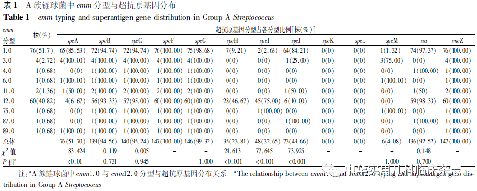 结果2.1 GAS菌株及病例相关信息 共分离到147株GAS菌株。在147例患儿中,男98例(66.67%),女49例(33.33%);年龄(6.2±1.9)岁(2岁4个月~12岁5个月),其中≤3岁5例(3.40%),>3~6岁65例(44.21%),>6~12岁75例(51.02%),>12岁2例(1.36%)。2.2 emm分型及SAgs基因分布 147株GAS中包括9种emm分型,其中最多的为emm1.0型76株(51.70%),其次为emm12.0型60株(40.82%),余7种emm分型的菌株均少于5株。SAgs基因speF、smeZ、speG、speC、speB和ssa的检出率分别为100.00%(147/147株)、100.00%(147/147株)、99.32%(146/147株)、95.24%(140/147株)、94.56%(139/147株)、92.52%(136/147株),speA、speJ、speI、speH和speM检出率分别为51.70%(76/147株)、49.66%(73/147株)、32.65%(48/147株)、23.81%(35/147株)和4.08%(6/147株),未检测到speK及speL。结果见表1。