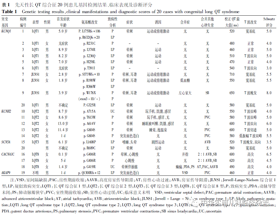 资料与方法1.1 研究对象 回顾性研究。选取2011年4月15日至2021年4月15日山东大学附属省立医院小儿心脏科收治的20例诊断为先天性LQTS且行基因检测的患儿为研究对象,男女各10例,诊断年龄0~14岁。收集并分析所有患儿的临床资料,先证者的一级亲属也接受临床评估、心电图和基因检测。本研究通过山东大学附属省立医院医学伦理委员会批准(批准文号:NSFC:NO.2018-115),患儿监护人均知情同意并签署知情同意书。1.2 LQTS诊断标准 根据2013年美国心律学会(HRS)/欧洲心律学会(EHRA)/亚太心律学会(APHRS)遗传性心律失常综合征患者诊断和治疗专家共识[4]:(1)满足以下1种或多种情况,可确诊:①排除导致QT间期延长的继发性因素、Schwartz诊断评分≥3.5分;②存在至少1个明确的LQTS基因致病性突变;③十二导联心电图提示校正QT(QTc)间期≥500 ms,排除导致QT间期延长的继发性因素。(2)十二导联心电图QTc介于480~499 ms之间,存在以下情况亦可诊断:不明原因晕厥、排除QT间期延长的继发性因素、未发现LQTS基因致病性突变。1.3 临床资料收集 基因检测先后委托多家第三方公司[北京信诺佰世医学检验所、北京诺禾心康基因科技有限公司、明码(上海)生物科技有限公司、北京迈基诺医学检验所],先证患儿均采用高通量测序方法,患儿家属采用Sanger测序进行验证。收集基因检测报告。其他收集资料包括:年龄、性别、病史、体征、心电图、动态心电图、超声心动图、脑电图、颅脑CT、颅脑磁共振成像(MRI)、血糖、电解质、治疗方式及效果。其中心电图QTc最大值为至少2次重复测得的结果。治疗效果分为(1)有效:患儿不适症状缓解和/或心律失常得到控制;(2)无效:患儿不适症状和/或心律失常无改善。1.4 统计学处理 采用SPSS 25.0统计学软件进行数据处理,计数资料用例(%)表示,符合正态分布的计量资料用x̄±s表示。组间比较采用独立样本t检验或Fisher′s确切概率法。P<0.05为差异有统计学意义。