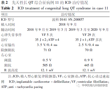 讨论先天性LQTS属单基因遗传性心脏离子通道病[5],既往国际文献报道基因检测阳性率为72%[6],本中心90.0%的患儿检测出致病或疑似致病突变,这可能与本课题组对假阴性患儿进行多次检测有关。本中心先证患儿均采用高通量测序方法进行基因检测。高通量测序技术相对于一代测序具有速度快、准确率高、成本低等优点[7],但在临床应用中存在一定的假阴性率,且缺乏统一的质控标准[8]。Schwartz等[3]报道,KCNQ1(LQT1)、KCNH2(LQT2)、SCN5A(LQT3)约占临床确诊LQTS的75%。在430例LQTS患者中,KCNQ1、KCNH2、SCN5A突变检出率约为71%[9]。Tester等[10]报道,在272例无血缘关系的LQTS患者中,KCNQ1、KCNH2、SCN5A总检出率约为77%。本中心LQT1、LQT2、LQT3患儿共13例(65.0%),与以往报道大致相符。但JLNS1(15.0%)及LQT8(15.0%)占比却明显增高。既往文献报道JLNS1在儿童中的发病率为1/1 000 000~1/200 000[11],LQT8的发病也非常罕见[2],这2种类型在LQTS患者中的占比均<1%[12]。本研究中的LQT8与JLNS1占比与报道偏差较大,可能与这2种类型患儿临床表现重、症状典型且出现早有关,而LQT1、LQT2、LQT3临床表现相对较轻、症状出现时间较晚甚至终身无症状,同时存在部分以晕厥或抽搐为首发症状患儿被误诊为癫痫等疾病而长期于其他科室诊治的情况。不同分型LQTS的诱因各具特点。据报道,LQT1发病常见于运动或情绪激动时,LQT2诱因多为情绪应激,如铃声或突然唤醒等,LQT3心脏事件常发生于休息或睡眠状态[13]。本中心LQT1出现症状的诱因均与运动有关,但有1例诱因为运动或情绪激动,该患儿具有复合杂合移码突变,表现为较轻的运动刺激即可诱发晕厥,与JLNS1的发作诱因相同,LQT2均表现为与运动无关的诱因。玩手机、睡眠、睡眠被唤醒、泡温泉诱发晕厥可能是因为情绪应激,感冒、饥饿不排除与炎症因子增多、血糖水平降低等因素有关。LQT3患儿剧烈运动后出现嗜睡、头晕、心动过缓,与以往报道[2]不符,但最近有报道称20%的LQT3患者可于运动时发生心脏事件[14]。晕厥与非晕厥患儿的QTc时间差异无统计学意义。2例LQT1患儿反复测十二导联心电图QTc虽不超过480 ms,但均有晕厥史及家族史,据报道30%~40%的LQT1患者具有隐匿性特征[4,15],即静息状态心电图QTc间期正常或临界延长。有研究表明,QTc只预测第1次心脏事件,QTc持续时间≥500 ms是首次心脏事件的独立预测因子,但已经经历过晕厥发作的LQTS患者,无论其QTc值如何,都应被认为有较高复发性晕厥发作的风险[16]。研究显示,口服普萘洛尔剂量≥1.5 mg/(kg·d)组的有效率高于剂量<1.5 mg/(kg·d)组患儿[4],提示β受体阻滞剂作为LQTS的一线治疗用药,可预防晕厥等恶性心律失常事件。本研究接受ICD治疗的3例患儿中,1例未遵医嘱调整药量,反复晕厥,ICD植入后记录到多次心室颤动,经及时发放ATP及电击除颤治疗,防止了患儿猝死。本研究存在不足之处:首先,单中心研究的样本量较小,很多项目无法进行统计学分析,只能对多个病例进行总结;其次,基因检测委托多家第三方公司进行,缺乏统一的质控标准,且由于样本量较小,无法对检测质量进行比较;患儿及家长依从性差,不遵医嘱增减药量及自行停药现象频繁,影响治疗效果的分析。综上,先天性LQTS作为单基因遗传性心律失常疾病,基因诊断和临床诊断有较高的一致性。基因检测阳性率为90.0%。临床表现、心电图特点因基因分型而异。β受体阻滞剂具有保护作用。口服药物治疗无效时,接受ICD治疗可防止心脏性猝死的发生。