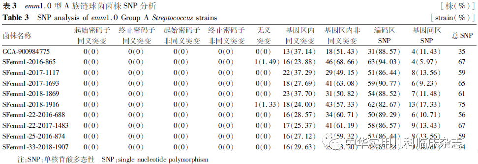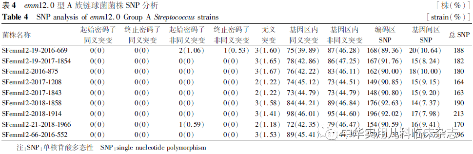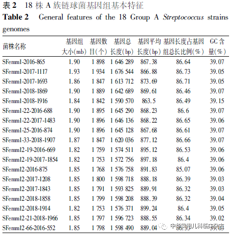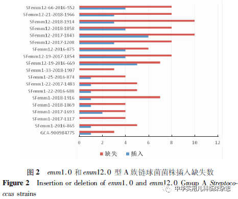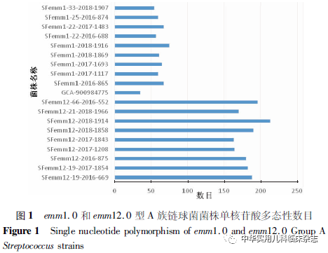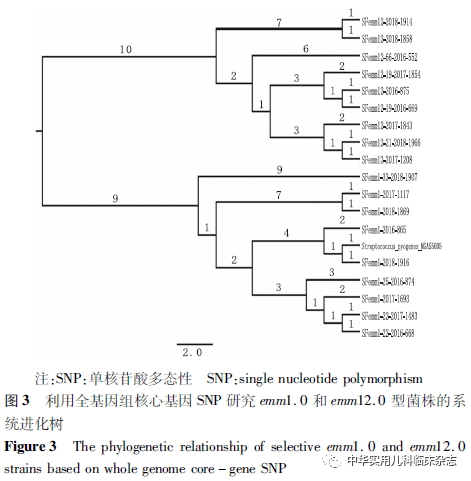 资料与方法1.1 菌株 选择深圳市儿童医院生物样本库收集保存的176株GAS分离株,分离自2016年1月1 日至2018年5月31日在深圳市儿童医院门诊或住院的猩红热患儿(0~18岁)。对176株GAS分离株进行emm分型,选取具有代表性的18 株GAS分离株进行全基因组测序。本研究已通过深圳市儿童医院医学伦理委员会批准(批准文号:202104702),患儿监护人均知情同意,并签署知情同意书。18株GAS菌株选择标准:(1)来自不同年份emm1.0、emm12.0 主型 GAS 菌株各 5 株;(2)各年度emm1.0 和emm12.0 亚型各选1株,其中emm1.22、emm12.19型分别选取来自不同年份2株;(3)各年度菌株数相同,其中2016年、2017年、2018年各6株。本研究共选取导致深圳市儿童猩红热的emm1.0型(包括亚型)GAS 菌株 9株,emm12.0 型(包括亚型)GAS 菌株 9株。1.2 方法1.2.1 emm分型检测 通过PCR扩增及测序获得emm基因的5′端可变区序列并上传至分型数据库(https://www2.cdc.gov/vaccines/biotech/strepblast.asp)进行比对分析,确定emm型别。1.2.2 基因组序列测定 基因组测序由深圳华大基因公司使用lllumina Hiseq4000系统(美国lllumina公司)完成,测序后序列使用SOAPdenovo v1.05软件组装。1.2.3 比较基因组分析 (1)共有基因和特有基因:将所有待分析菌株的基因集进行聚类分析,将得到的基因集作为总基因集,提取聚类结果中每个样品都有的序列为核心基因集,特有的序列为特有基因集。(2)单核苷酸多态性(SNP)及插入或缺失(InDel)检测:SNP检测与注释基于组装结果和参考序列比对进行,首先对过滤后的序列进行组装,将组装结果与参考序列进行比对,进行SNP及基因组的某个位置上所发生的小片段序列的InDel。(3)基于SNP位点分析构建遗传进化树:按照相同顺序将所有SNP相连,获得相同长度的序列(其中一个为参考序列),作为输入文件,用TreeBeST软件的最大似然法算法构建系统进化树。1.3 统计学处理 采用SPSS 21.0 统计软件,符合正态分布的计量资料以x̄±s表示,非正态分布计量资料以M(Q1,Q3)表示,计数资料以百分比或率表示,率的比较采用χ2检验、校正χ2检验,非正态分布计量资料比较采用秩和检验,P<0.05 为差异有统计学意义。