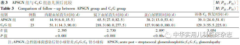讨论APSGN由A组β型溶血性链球菌诱发的免疫介导的肾小球疾病,是儿童急性肾小球肾炎的常见诱因之一,预后良好。但一些非典型APSGN病例临床表现重,病情迁延不愈,甚至合并慢性肾衰竭。APSGN的特征是补体旁路途径激活导致补体C3降低,其通常在8周内恢复正常。对于8周后仍存在持续低补体或反复低补体的APSGN患儿,应及早行肾活检以排除特发性膜增殖性肾小球病,其中以C3沉积为主的膜增殖性疾病被归为C3G。C3G根据超微结构分为致密物沉积物、C3肾小球肾炎(C3GN)及补体因子H相关蛋白5肾病。C3G主要发生于儿童,其在诊断后10年内进展为终末期肾病的比例约为70%,预后较差[5]。链球菌感染与C3G之间存在明显关联,部分C3G患者病初被诊断为APSGN,但目前缺乏针对两者的临床研究[3,6-7]。APSGN的全球发病率正逐年下降,发病率约(9.5~28.5)/100 000人,其中97%发生于发展中国家[8]。有报道称APSGN在美国、法国、意大利及我国已被视为较罕见疾病,其发病率的降低可能归功于早期适当的抗生素治疗[9]。而C3G是一种更为罕见的疾病,每1 000 000人中仅 1~5人发病[10]。本研究表明,APSGN确诊率逐年下降,由29例/年降至4例/年;而随着对C3G认识的加深及肾活检接受度的提高,C3G的肾活检检出率为 3~12例/年,检出率有上升趋势。本研究中 APSGN 组与C3G组发病年龄差异无统计学意义,主要发生于学龄期儿童。儿童的肾小球基底膜(GBM)孔径较小阻碍了免疫复合物的有效清除,这可能是儿童发病率较高的原因之一[11];另一方面,免疫细胞的数量、亚群和定位存在年龄依赖性差异[12],影响宿主对链球菌的反应,学龄期儿童肾功能及身体机能处在生长发育的过渡阶段,使得学龄期儿童免疫反应较重,炎症应激水平较高[13],易出现较严重的肾损伤。此外,婴幼儿的低发病率可能是由于此年龄段链球菌感染率较低、免疫系统不成熟及形成免疫复合物较少[14]。本研究中,APSGN和C3G的男童发病率均为女童的2倍左右,提示男女有不同的易感性。APSGN和C3G均急性起病,病情轻重不一,临床表现轻者仅尿常规异常,严重者表现为少尿、无尿甚至肾衰竭。Khalighi等[11]报道23例初诊为APSGN的病例,经肾脏病理检查,其中13例最终确诊为C3GN。Sawanobori等[7]报道了1例最初被诊断为APSGN的男童,早期为无症状血尿且病情自发缓解,6年后再次感染链球菌并最终确诊为C3G。这提示APSGN与C3G之间存在着复杂的联系,实际临床诊疗过程中有时难以对二者进行区分。本研究中对73例APSGN和27例C3G患儿发病初期的临床表现进行对比发现,C3G组的肉眼血尿发生率、肾病水平蛋白尿发生率均高于APSGN组。且随着随访时间的延长,C3G患儿的肉眼血尿消失时间、蛋白尿缓解时间均长于APSGN患儿。APSGN是一种免疫复合物介导的疾病,有多种机制参与肾损害的发生,其发病通常为免疫复合物引起的补体系统的一过性激活。目前公认的致病机制为:(1)含链球菌抗原成分的循环免疫复合物在肾脏沉积;(2)链球菌抗原在肾脏基底膜沉积,进而引起原位免疫复合物形成;(3)GBM与链球菌抗原的抗体发生交叉免疫反应(分子模拟);(4)自身免疫反应[4]。近期研究发现,34例确诊APSGN的患儿中,31例的B因子抗体均为阳性[15]。B因子抗体水平的一过性增高与补体C3、末端补体复合物C5b9的水平相关,可增强补体旁路途径转化酶的活性,介导补体旁路途径的过度激活,进而导致APSGN中基底膜破坏,出现相应的临床反应。而C3G患儿未检测到B因子抗体,提示C3G与APSGN患儿补体旁路途径的激活过程存在差异[15]。因此,对持续性或反复低补体C3的APSGN患儿,筛查B因子抗体可能有助于指导肾活检,以避免误诊为C3G。此外,研究表明C3G患者多存在补体途径调节异常,如H因子、H因子相关蛋白及B因子的突变[16-18],补体途径调节异常可引起免疫反应的过度激活和免疫复合物的大量沉积,导致病情较重或迁延不愈[19]。以上结果提示,对于病初临床表现较重,病情迁延不愈的APSGN患儿,应高度怀疑C3G的可能性。本研究中73例APSGN患儿和27例C3G患儿的补体C3均减低。补体C3减低是由于补体级联反应的激活和免疫复合物的形成,补体因子消耗增加所致。本研究发现10例(13.7%)APSGN患儿补体C4减低,3例(11.1%)C3G患儿补体C4减低。Ohsawa等[20]研究证实,凝集素(MBL)途径可识别链球菌神经氨酸酶抗原,在链球菌感染中可被激活,从而导致补体C4水平降低。Marinozzi等[21]研究发现,10%的C3G患者可检测到C3转化酶C4b2a抗体,其补体C4水平降低,表明MBL途径也参与C3G的发病机制 。因此推测,APSGN和C3G患儿补体C4降低可能由MBL途径激活或本身存在补体功能缺陷所致。本研究中48例患儿因临床表现不典型行肾脏病理检查,其中27例患儿确诊为C3G,16例确诊为IgA肾病,1例确诊为Alport综合征,仅4例最终仍确诊为APSGN。这提示,对于病初临床表现比较重、病情迁延不愈的不典型APSGN患儿完善肾活检的必要性,以便早期识别其他预后不良的肾小球疾病。此外,APSGN多为自限性疾病,而C3G病程多迁延反复或逐渐进展。对临床表现不典型的患儿(血肌酐持续性或进行性升高超过1周,血肌酐4周内未恢复正常,肉眼血尿超过4周,蛋白尿持续超过8周,持续性或反复低补体血症超过8周)行肾脏病理检查,是基于患儿偏离APSGN的自然病程而考虑其他肾小球疾病。但当C3G患儿临床表现较轻,病程较短时,有诊断为APSGN的可能性。因此,对于病初诊断为APSGN的患儿,建议出院后定期检测尿常规、补体、肾功能等指