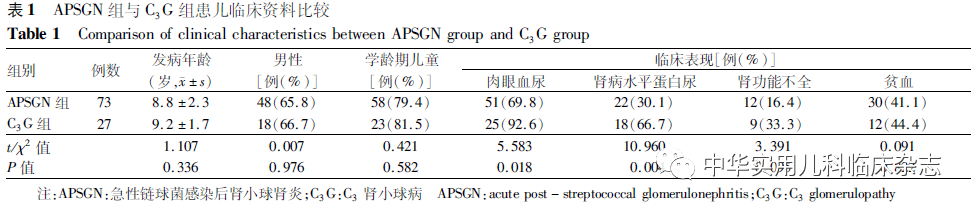 结果2.1 临床资料 73例APSGN患儿中,男48例,女25例,以学龄期儿童为主(58例,79.4%)。27例C3G患儿中,男18例,女9例,以学龄期儿童为主(23例,81.5%)。2组患儿年龄、性别比较,差异均无统计学意义(均P>0.05)。73例APSGN患儿均有镜下血尿,其中51例(69.8%)有肉眼血尿。2组患儿肉眼血尿发生率及肾病水平蛋白尿发生率比较,差异均有统计学意义(均P<0.05)(表1)。