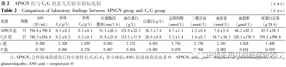 资料与方法1.1 研究对象 回顾性分析。选取2016年1月至2021年12月首都医科大学附属北京儿童医院肾内科收治的病初符合APSGN诊断标准的117例患儿为研究对象。纳入标准[4]:(1)有前驱感染史,抗链球菌溶血素O(ASO)升高;(2)急性起病,有肾小球肾炎表现,如血尿、蛋白尿、少尿、水肿、高血压;(3)起病时补体C3水平下降。排除标准:根据临床表现、家族史、实验室检查排除其他原发性、继发性肾小球疾病(如IgA肾病、紫癜性肾炎、狼疮性肾炎等)、高钙尿症及遗传性肾病等。117例APSGN患儿中,26例最初诊断为APSGN的患儿因蛋白尿持续超过8周行肾脏病理检查,其中2例确诊为 APSGN,6例确诊为IgA肾病,18例确诊为C3G;此外,22例患儿因血肌酐持续性或进行性升高超过1周,血肌酐4周内未恢复正常,肉眼血尿超过4周,持续性或反复低补体血症超过12周等行肾脏病理检查,其中2例患儿确诊为APSGN,9例患儿确诊为C3G。排除17例肾脏病理检查为其他继发性肾小球肾炎(IgA肾病)和遗传性肾病(Alport综合征)的患儿,最终纳入患儿100例,其中APSGN患儿73例(APSGN组),C3G患儿27例(C3G组)。本研究通过首都医科大学附属北京儿童医院医学伦理委员会批准[批准文号:(2022)-E-132-R],患儿监护人均知情同意,并签署知情同意书。1.2 研究方法 1.2.1 临床资料收集 收集患儿临床资料,包括:(1)一般资料:年龄、性别、临床表现及治疗;(2)临床检查结果:白蛋白、总胆固醇、肌酐、尿素氮、尿蛋白、尿红细胞、24 h尿蛋白、ASO、补体C3、补体C4、红细胞沉降率及肾脏病理;(3)随访资料:肉眼血尿消失时间、尿红细胞恢复时间、尿蛋白转阴时间、补体C3恢复时间。1.2.2 C3G诊断标准 (1)光镜下可见肾小球系膜增生、膜增生、毛细血管内皮增生或新月体;(2)免疫荧光为显著的C3沉积为主,C3沉积至少较其他免疫反应物高2个数量级;(3)电镜下多为电子致密物沉积于肾小球基膜区、系膜区、系膜旁区以及肾小管和肾小球囊基底膜内等。1.2.3 临床指标判定标准 (1)肾病水平蛋白尿:24 h尿蛋白定量>50 mg/kg或总量>3.5 g;(2)镜下血尿:离心尿红细胞≥3个/高倍视野(HP),且为肾小球来源;(3)高血压:血压≥120/80 mmHg(1 mmHg=0.133 kPa)(学龄前期)或 130/90 mmHg(学龄期);(4)少尿:24 h尿量<300 mL(学龄前期)或 400 mL(学龄期);(5)肾功能不全:血肌酐>健康儿童肌酐水平;(6)低蛋白血症:血白蛋白<25 g/L;(7)低补体 C3 血症:补体 C3<0.7 g/L;(8)ASO 阳性:ASO>0.2 U/L;(9)临床治愈:临床症状消失,尿常规正常。1.2.4 治疗与随访 患儿均予休息、抗感染、利尿、降压等对症支持治疗。若对症支持治疗无效则应用糖皮质激素或注射用甲泼尼龙琥珀酸钠治疗,视病情予其他免疫抑制剂治疗。患儿出院后均行门诊或电话随访,未失访则均随访至2021年12月,记录患儿病情变化。1.3 统计学处理 应用SPSS 19.0 软件进行数据分析。正态分布的计量资料以x̄±s表示,两组间比较采用成组t检验;非正态分布计量资料以M(P25,P75)表示,组间比较采用Mann-Whitney U检验。计数资料以例数(%)表示,组间比较采用χ2检验。P<0.05为差异有统计学意义。