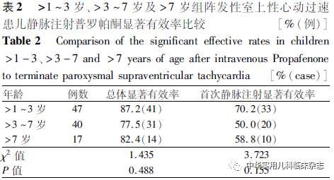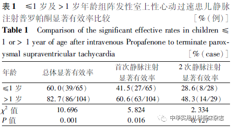 结果2.1 临床特点 169例PSVT患儿中,≤1岁65例(38.5%),>1~3岁47例(27.8%);>3~7岁40例(23.7%);>7岁17例(10.1%);169例患儿发病年龄0.5(0.1,1.9)岁;本次心动过速发作用药年龄2.0(0.5,3.8)岁;心动过速发作时心室率(216.9±32.8)次/min(140~300次/min),心动过速发作频率7(4,15)次/年,心动过速持续时间为1.5(0.5,3.0) h。169例患儿PSVT首发就诊原因中,90.5%(153/169例)为非特异性表现,包括呼吸道、消化道等感染61例(36.1%),纳差、乏力、烦躁、喂养困难等全身状态差48例(28.4%),腹痛、呕吐等消化道症状13例(7.7%),家长发现心跳快13例(7.7%),体检10例(5.9%),宫内产前就诊时发现8例(4.7%);9.5%为心悸(12例)、头晕(2例)、晕厥(2例)。13.0%(22/169例)的患儿心动过速发生于感染期,以呼吸道感染为主(63.6%,14/22例)。14.2%的患儿(24/169例)合并先心病,其中合并房间隔缺损等简单先心病15例。169例患儿静脉注射普罗帕酮前后意识均清醒;1例(0.6%)出现低血压、口唇发白、四肢皮温凉及头晕不适,余患儿精神状态、口唇颜色、皮温、血压及SPO2用药前后未见明显差异。4.1%(7/169例)的患儿并发心动过速性心肌病,心动过速持续时间为6.3(5.0,9.0) h,而非心动过速性心肌病患儿心动过速持续时间为1.2(0.5,2.5) h,2组比较差异有统计学意义(Z=134.500,P=0.001)。PSVT 有效复律后,LVEF由(44.0±4.0)%上升至(53.7±6.9)%,差异有统计学意义(t=-4.700,P=0.003)。2.2 药物疗效 2.2.1 有效率 169例患儿缓慢静脉注射普罗帕酮总体显著有效率74.0%(125/169例),转复窦性心律时间为5.0(3.0,12.5) min,其中首次静脉注射普罗帕酮显著有效率53.3%(90/169例),转复窦性心律时间为4.0(3.0,5.0) min;79例部分有效及无效患儿中有57例间隔5 min第2次缓慢静脉注射普罗帕酮,显著有效率为38.6%(22/57例,5例为首次静脉注射无效者;17例为首次静脉注射部分有效者,其中6例再次静脉注射转复窦性心律后予持续泵入普罗帕酮),转复窦性心律时间为18.0(15.8,20.5) min;35例第2次静脉注射部分有效及无效患儿中有17例间隔5 min后第3次静脉缓慢注射普罗帕酮,显著有效率 64.7%(11/17例,7例为静脉注射后予以持续泵入普罗帕酮)。总体部分有效率12.4%(21/169例),首次静脉注射普罗帕酮部分有效率23.1%(39/169例)。169例患儿中19例患儿为缓慢静脉注射普罗帕酮后持续泵入普罗帕酮以维持窦性心律,显著有效率为68.4%(13/19例),转复窦性心律时间为26(20,110) min,其中6例为首次静脉注射部分有效者,第2次静脉注射转窦后予以维持泵入;1例为前2次静脉注射无效者(心率可下降50次/min左右),第3次静脉注射转窦后予以维持泵入;1例为前2次静脉注射无效者(心率总体下降40次/min左右),第3次静脉注射后予维持泵入8 h转复窦性心律;2例为首次静脉注射无效、第2次静脉注射部分有效者,第3次静脉注射后分别予维持泵入3 h、5.5 h后转复窦性心律;3例为前2次静脉注射部分有效者,第3次静脉注射转复窦性心律后予以维持泵入。静脉注射普罗帕酮首次(53.3%,90/169例)与总体(多次)(74.0%,125/169例)显著有效率比较,差异有统计学意义(χ2=15.657,P<0.001)。合并先心病或感染者静脉注射普罗帕酮显著有效率分别为70.8%(17/24例)、68.2%(15/22例);普罗帕酮显著有效率与是否合并先心病[74.5%(108/145例) 比 70.8%]或感染[74.8%(110/145例)比 68.2%]差异无统计学意义(χ2=0.142,P=0.706;χ2=0.439,P=0.508)。2.2.2 不同年龄组药物疗效 年龄≤1岁组,总体显著有效率60.0%(39/65例),总体部分有效率16.9%(11/65例);>1岁组,总体显著有效率82.7%(86/104例),总体部分有效率9.6%(10/104例);2组不同年龄患儿总体显著有效率比较差异有统计学意义(χ2=10.696,P=0.001)。结果见表1。