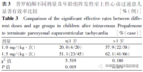 讨论PSVT是儿童时期最常见的心律失常,其发病率约为1.03/1 000[7],为儿科常见的急症之一[7-8]。由于儿童患者症状的不典型性、表达能力受限、PSVT的自限性及儿科医师对疾病认识的不充分性可能致其真正发病率被低估。本组169例患儿中90.5%首发症状为非特异性,多以感染、喂养困难、烦躁等就诊时查体发现,因此在临床工作中接诊上述患儿时需警惕快速性心律失常的可能,以防误诊、漏诊导致心动过速持续损伤心功能。儿童PSVT持续发作未能及时转复为窦性心律可损伤心功能,导致心动过速性心肌病,其为可逆的获得性心肌病,心动过速终止后,心功能可明显改善并恢复正常[6]。本组资料中心动过速性心肌病发生率为4.1%,其心动过速持续时间为6.3(5.0,9.0) h,有效控制心动过速后,心功能均明显改善。因此PSVT发作应尽快终止心动过速或积极控制心室率,防止心动过速性心肌病的发生。为尽快终止PSVT需静脉应用抗心律失常药物,我国儿科常用药物为三磷酸腺苷(ATP)、普罗帕酮等。ATP虽为急诊复律的一线用药[1-2],但儿童转复率仅为44.2%[9],特别是在婴儿中转复律低至9%~35%[9-10]。普罗帕酮为 Ⅰc类抗心律失常药物,主要为Na通道阻滞功能,兼有β受体阻滞及较弱的Ca离子拮抗作用,可以减慢房室结及旁路的传导速度,在PSVT中对旁路及快径的逆传功能抑制作用更加突出,从而达到终止心动过速的效果[5,11-12]。关于普罗帕酮对儿童PSVT复律效果、不良反应及影响因素的研究国内外报道极少,且均为小样本量研究,缺乏可靠的研究数据。有文献报道[5,13-14],儿童 PSVT 静脉注射普罗帕酮急诊复律的显著有效率为 60.0%~85.7%(纳入10~36例患儿,剂量为 0.7~1.5 mg/kg)。本组169例儿童PSVT普罗帕酮急诊转复总体显著有效率为74.0%。本研究结果显示,普罗帕酮急诊复律有效率与用药次数、年龄及剂量相关:(1)有效率与用药次数相关:首次缓慢静脉注射普罗帕酮显著有效率为53.3%,而重复用药(总剂量<5 mg/kg)显著有效率可提升至74.0%,考虑为重复用药提高血药浓度接近负荷量可提高有效率。(2)有效率与年龄相关:婴儿复律成功率低于其他年龄组。比较≤1岁和>1岁组,总体显著有效率(60.0%比 82.7%)及首次静脉注射显著有效率(41.5%比 60.6%)差异均有统计学意义。而1岁以上3个年龄组之间差异无统计学意义。(3)有效率与单次静脉注射药物的剂量部分相关:比较总体 1.0 mg/kg 和1.5 mg/kg 剂量组显著有效率差异无统计学意义。但在≤1岁年龄组,每次1.5 mg/kg剂量组的显著有效率明显高于1.0 mg/kg剂量组(51.1%比20.0%);而在>1岁组,2种不同剂量的显著有效率比较差异无统计学意义。提示婴儿期采用单次1.5 mg/kg剂量可提高复律的成功率。复律有效性年龄差异可能的原因:(1)年龄越小,心脏兴奋性和传导性越强,抗心律失常药物不易阻断折返环路兴奋的传导[15];(2)部分婴儿房室瓣环纤维化尚未完善,多旁路发生率相对较高,可形成旁路与旁路间的折返环路[16-17]。普罗帕酮的主要不良反应为心肌的负性肌力及致心律失常作用[4,18],表现为房室传导阻滞、室内差异性传导、非持续性心动过速蜕变为持续性心动过速、心脏骤停、猝死等。一项欧洲多中心关于儿童心律失常患者口服普罗帕酮安全性的研究显示其不良反应总体发生率约为2.5%[18],其中心脏骤停及猝死发生率为0.6%,多发生于合并结构性心脏病的患儿。有研究报道在伴心功能轻中度损伤的室上性心动过速成人患者中,应用静脉普罗帕酮复律成功率达88.9%,且未发生心功能恶化[19]。本组1例发生系统性不良反应,为伴右心功能不全的复杂先心病患儿。心脏传导异常发生率为8.9%,均短时间内自行恢复正常。心功能轻中度损伤患儿未发生心功能恶化。有研究报道存在心室收缩功能障碍可增加普罗帕酮的负性肌力作用,如合并先心病则更易诱发心力衰竭的恶化[20-22]。本组患儿未发生心脏骤停及猝死等严重不良反应,可能的原因为对心功能明显损伤的患儿未选择应用普罗帕酮。对于心功能轻中度受损患儿,应用普罗帕酮需谨慎,可减慢静脉注射速度并严密监测血压、心率、心律的变化。在心功能明显受损或心动过速持续无休止心功能损伤程度不明时,应避免使用普罗帕酮。综上所述,静脉应用普罗帕酮可相对安全有效地终止儿童PSVT,总显著有效率为74.0%,其复律成功率与年龄、剂量及用药次数相关。婴儿复律成功率低于其他年龄组,但与单次用药剂量呈正相关。重复用药(总剂量<5 mg/kg)复律成功率高于单次用药。在持续心动过速伴心功能轻中度损伤患儿中应用静脉普罗帕酮复律虽未发生心功能恶化,但需谨慎选用。
