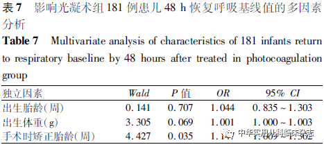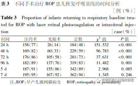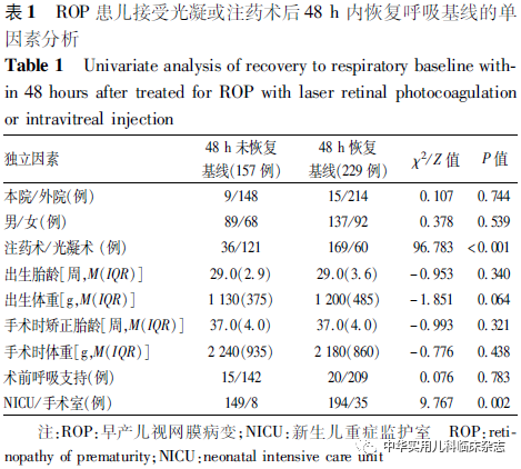 讨论随着围生医学和护理技术的持续进步,早产儿的成活率逐年增高,而ROP的发生率也呈增长趋势,并且逐渐成为发展中国家儿童失明的首要原因[2],早期发现和及时有效的干预治疗是ROP患儿获得良好视力预后的关键因素。而激光光凝术和玻璃体注药术治疗ROP的过程却是痛苦的。近年来关于早产儿ROP围术期心肺系统不良事件的报道较多,如2020年的一项研究发现,ROP光凝术中不良事件最常见的为低血压、使用眼药水相关的高血压和心动过缓,术后最常见的为低体温和拔管后呼吸暂停[10],部分早产儿拔管后由于支气管痉挛和喉头水肿需要紧急重新插管和机械通气[11]。由于早产儿身体各系统发育不成熟,合并呼吸窘迫综合征、支气管肺发育不良、持续肺动脉高压、动脉导管未闭、颅内出血及胃肠动力差等并发症概率较高。为提供理想的手术条件,如何加强气道和麻醉管理以降低围术期风险仍未完全确定。近年来,在广东省妇幼保健院接受激光治疗期间的患儿麻醉采用静脉镇痛和机械通气方式,而玻璃体注药术则在局部麻醉下进行。既往研究发现静脉麻醉联合气管插管下进行光凝术有出现拔管延迟的风险[12],国外回顾性研究发现80.5%的患儿在手术结束时仍处于插管状态,40.3%的患儿术后24 h以上仍处于机械通气状态[10]。呼吸状态的不稳定可以通过在给定的氧浓度下使用高级别的呼吸支持方法来改善,或通过在给定的呼吸支持方法中额外提高氧浓度来解决。目前国内外对于早产儿接受ROP治疗对呼吸系统影响的研究不多,关于气管插管接受手术后拔管延迟尚无统一定义,本研究通过分析呼吸支持和增加氧浓度的方法来评估48 h内恢复呼吸基线的主要研究结果[13]。本研究组患儿中48 h后无法恢复呼吸基线更可能是通过改变呼吸支持方法来解决的。纳入本研究的ROP患儿共386例,157例患儿在术后48 h未恢复至呼吸基线状态,其术前需要呼吸支持的比例与48 h恢复基线组无差异,其中有77.1%的患儿接受了激光光凝术,比例明显高于48 h恢复呼吸基线组。通过对ROP术后患儿恢复呼吸基线时间的分析发现,光凝术组患儿在术后恢复到呼吸基线的时间明显长于注药术组,且差异持续约4 d。对光凝术组181例患儿进行分析发现,48 h恢复呼吸基线组患儿接受的激光点数与48 h未恢复基线组无差异,可能从侧面说明光凝术持续时间对术后呼吸状态无影响。但光凝术组患儿的出生胎龄、出生体重及手术时矫正胎龄越小,48 h内恢复呼吸基线的可能性越小。这一发现与国外相关研究结果一致[10]。同时经多因素回归分析显示,手术时矫正胎龄小是接受光凝术患儿术后48 h恢复呼吸基线的独立危险因素。因此,ROP患儿在静脉麻醉联合气管插管接受光凝术时胎龄越小出现围术期并发症的风险越高。有研究表明机械通气可通过触发肺泡上皮、血管内皮、中性粒细胞、巨噬细胞和通过自分泌和旁分泌信号转导的促炎介质的释放,肺泡 Ⅱ 型上皮细胞、血管内皮细胞的大量凋亡可引发肺水肿和肺换气功能障碍,可进一步诱发急性呼吸窘迫综合征[14]。同时,表浅麻醉下的气管插管有诱发心动过缓、血氧饱和度下降、血压升高甚至气道损伤等不良反应;多次插管尝试次数与患儿损伤和缺氧的程度关系密切[15]。因此当ROP患儿接受额外的气管插管机械通气时,应加强围术期气道监护,重视“肺保护策略”的实施,以减少机械通气所带来的不良影响。通过对注药术组205例患儿分析发现,术前需要呼吸支持、术时矫正胎龄越小,48 h内恢复呼吸基线的可能性越小。新生儿都有发育良好的眼心反射,且早产儿比足月儿更容易受到伤害[16]。玻璃体注药术及激光光凝术引起的不适与疼痛可诱发机体的氧化还原反应失调,大量生成的活性氧可损伤肺血管内皮细胞和/或肺泡上皮细胞,引起肺毛细血管通透性增加及肺泡表面活性物质减少,造成肺水肿和肺不张。由此推测,ROP患儿手术时矫正胎龄越小,越容易出现生理状态的波动,影响术后呼吸状态的稳定,氧化应激反应所起的作用不容忽视。因此手术时矫正胎龄越小的ROP患儿在围术期,采用安全有效的镇静镇痛方案,减少刺激仍然是需要解决的问题。玻璃体注射VEGF抑制剂可能会降低视网膜脱离率,并获得更好的结构性结局[17]。但此类ROP患儿在后期复发和需要再治疗的风险增大[18]。激光光凝术会导致患儿出现视野丧失、高度近视和视网膜破坏等眼部并发症[19],接受光凝术的患儿出现拔管延迟、需要额外的呼吸支持增加。通过本回顾性研究发现,对于ROP患儿的治疗方案,不论采用激光光凝术还是玻璃体注药术,除了眼部因素,非眼部因素也需要综合评估。临床上ROP手术方案由眼科医师评估,而ROP患儿对手术的耐受术则由新生儿科医师决定,而评估指标仅仅是取决于临床上血氧饱和度及全身循环是否稳定。如何根据ROP患儿术前呼吸循环状态、矫正胎龄、营养状态进行专业可靠的术前评估,仍需业内专家来进一步研究;这对于医疗团队制定个体化的治疗方案至关重要,目的就是选择恰当的手术时机、合理的手术方案、安全有效的镇痛方案以避免额外的辅助通气,尽量减少围生期的并发症。本研究为单中心的回顾性分析,接受ROP治疗后呼吸基线恢复缓慢在多大程度上归因于手术时的镇静/镇痛方案、围术期呼吸管理及全身状况等因素,目前仍不清楚,这也是本研究的不足之处。因此,在术前耐