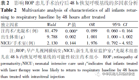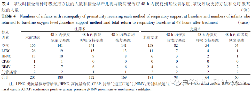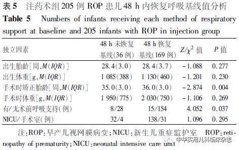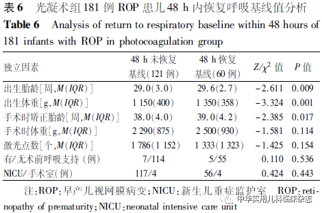 资料与方法1.1 研究对象 回顾性研究。收集2016年1月至2020年12月入住广东省妇幼保健院新生儿科并诊断为ROP的早产儿病历资料。入选标准:所有根据眼底筛查结果接受了ROP眼科治疗的早产儿;排除标准:家属拒绝或未接受眼科治疗的ROP患儿。治疗方案包括:玻璃体内注射anti-VEGF和视网膜激光光凝术。手术治疗标准主要参考美国儿科学会的 ROP筛查指引[5-6]。本研究已通过广东省妇幼保健院医学伦理委员会批准(批准文号:202201247),监护人在患儿入院时均已签署知情同意书。1.2 治疗方法 光凝术在静脉麻醉联合气管插管下进行,术前2 h持续静脉输注枸橼酸芬太尼注射液[剂量 2~5 μg/(kg·h)],专用开睑器开睑,使用 + 28 D 透镜辅助双目间接检眼镜直视下,用 810 nm 的 Iridis 激光机(激光适配器为法国Quantel Medical 公司生产,双目间接检眼镜为德国 HEINE 公司生产) 对嵴和周边视网膜无血管区进行激光光凝,远周边视网膜通过巩膜压迫器辅助进行激光光凝,光凝范围包括从嵴到锯齿缘所有视网膜无血管区,激光能量为 100~450 mW,起始能量为 100 mW,逐渐增加至光斑为灰白色(3 级光斑),曝光时间为0.4 s,光凝点间隔约为0.5个光斑直径[7]。玻璃体注药则在局部麻醉下进行,术前5 min 经结膜囊滴入50 g/L盐酸丙美卡因滴眼液行表面麻醉,无需额外的呼吸支持。1.3 主要观察指标和分组 主要观察入组患儿在ROP手术后恢复到呼吸基线的时间。根据研究对象在ROP手术后48 h内是否恢复术前呼吸基线将患儿分为2组:48 h恢复基线组和48 h未恢复基线组。呼吸基线定义为ROP专科治疗前所采用的呼吸支持方式以及用氧参数[8]。气管插管辅助通气患儿撤机标准均参考2014版《新生儿机械通气常规》[9]。通过电子病历资料回顾性记录了患儿在基线(术前)以及主要观察时间点的呼吸状态。呼吸支持方式从低到高依次为:无呼吸支持、低流量鼻导管、高流量鼻导管、持续气道正压通气、无创机械通气、气管插管。在进行多因素分析时,在治疗前需要插管、无创机械通气、持续气道正压通气或高流量鼻导管的患儿均被标记为需要呼吸压力支持。1.4 统计学处理 应用SPSS 23.0统计软件进行数据分析。经统计本研究计量资料呈非正态分布,因此数据用中位数(四分位数间距)[M(IQR)]表示,两组间比较采用非参数秩和检验;计数资料用率表示,组间比较采用χ2检验或Fisher′s精确概率法;影响因素分析采用二分类Logistic回归分析;P<0.05为差异有统计学意义。