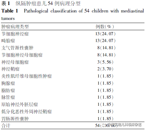 资料与方法1.1 研究对象 回顾性研究。选择2008年8月至2021年11月青岛大学附属医院小儿外科收治的经手术治疗的54例纵隔肿瘤患儿为研究对象。其中男23例,女31例;年龄4.80~156.00个月[(70.29±38.81)个月];身高62.00~158.00 cm[(115.59±23.54) cm];体重 7.9~43.0 kg[(22.66±8.74) kg],术后病理见表1。纳入的54例纵隔肿瘤患儿按照是否应用Hisense CAS 计算机辅助手术系统三维重建分为三维重建组和二维CT组。2008年8月至2014年1月的25例患儿为二维CT组。自2014年2月以后收治的29例患儿均应用Hisense CAS将其胸部二维增强CT图像重建为三维可视化图像,为三维重建组。本研究已通过医院医学伦理委员会批准(批准文号:QYFY WZLL 27032),患儿监护人均知情同意,并签署知情同意书。