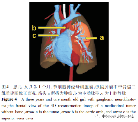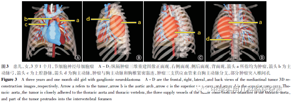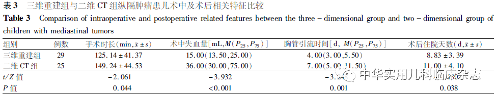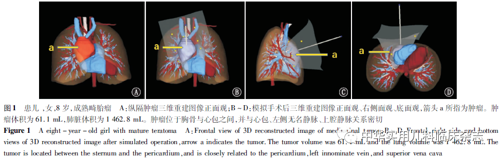 讨论在评估纵隔肿瘤时, CT通常是诊断成像的首选方式[5]。由于其独特的解剖位置,纵隔肿瘤可能会压迫气道导致急性或慢性呼吸功能不全[6],也可压迫心脏或大血管引起血流动力学失代偿而危及患儿生命,这些情况被称为纵隔肿块综合征(MMS)[7]。大多数纵隔肿瘤患者在首次就诊时无特异性症状,容易造成漏诊,导致肿瘤体积过大而不利于患儿预后[8]。因此,对纵隔肿瘤的患者进行详细的术前成像,了解肿瘤与周围组织的空间解剖关系对精准手术是极其必要的。纵隔畸胎瘤是最常见的纵隔生殖细胞肿瘤,约占儿童前纵隔肿瘤的25%[9]。通常畸胎瘤发现时体积已较大,压迫周围组织出现咳嗽、憋气、胸痛等症状[10],且畸胎瘤通常与周围正常血管、神经交互混杂生长,为术中完全分离肿瘤带来挑战。CT断层图像可显示肿瘤附近血管走行影,但无法直观描述肿瘤与血管神经的毗邻关系,外科医师无法凭此在术前进行详尽的手术规划,对CT图像进行三维重建后显示肿瘤边界清晰显示,肿瘤紧邻而未侵犯无名静脉与上腔静脉,可在术中安全分离而不必进行血管切除重建,按此进行精确的手术规划,大大缩短了手术时间。纵隔神经源性肿瘤起源于交感神经节的原始神经外胚层神经嵴细胞,其中神经母细胞瘤与节细胞神经母细胞瘤均为恶性肿瘤[11]。本研究中有1例神经母细胞瘤患儿以Honor综合征就诊,其三维图像显示肿瘤位于后上纵隔压迫颈交感干神经,外科医师根据三维图像,自患儿右胸后外侧做切口,成功完整切除肿瘤,患儿预后良好。在典型病例中通过CT判断患儿肿瘤体积较大,且部分延入椎管,考虑无法一期完整切除肿瘤,需穿刺活检后再决定下一步诊疗计划,三维成像后显示肿瘤供应血管来自胸主动脉,与其紧密黏连但未侵及,肿瘤前方边界较清,肿瘤未侵及脊髓,可行手术治疗,手术难点在于分离肿瘤与胸主动脉、胸椎、胸壁和肺叶,最终手术顺利完成。儿童纵隔狭小,且组织娇嫩,手术时应力求轻柔、仔细,当肿瘤包绕大血管、神经时,不可过于强求彻底剥除,避免损伤血管神经,造成大出血或血管损伤甚至死亡[3],因此术前精准定位就显得尤为重要。通过Hisense CAS三维重建,能对肿瘤与其周围血管神经解剖空间关系进行精准判断,协助外科医师术前精准规划,大大提高手术的可行性与安全性。三维重建能辅助外科医师完善术前规划手术方案,通过海信双子3D医学影像与计算机手术辅助系统在术中无菌精准指导手术。这是二维图像无法替代的优势。本研究结果显示三维重建组和二维CT组患儿在一般临床信息差异均无统计学意义(均P>0.05)的情况下,外科医师在进行纵隔肿瘤切除术时对照组患儿手术耗时要明显多于三维重建组。CT仅能提供二维图像,需要有经验的医师在脑海中构建肿瘤与周围脏器和血管的三维图像制定手术计划,这种方式存在着外科医师经验的客观偏差,且外科医师通过二维CT在脑海中构想的肿瘤与周围组织的解剖关系无法在术前得到验证,甚至需剖胸探查才能确定最终的手术方案,而三维重建图像使得外科医师在术前计划手术入路、模拟手术过程更还原于真实情况,便于与其他医师讨论,从而进行更加符合精准外科理念的完善的术前准备,进而有效缩短手术时间,减少麻醉和长时间手术暴露等给患儿带来的不良影响。计算机手术辅助系统将层厚0.625 mm的CT图像通过分割重建生成可旋转、交互式的三维立体构象,采用不同的色彩将肿瘤、器官、动脉、静脉等结构加以区分,有利于术前精准规划手术方案,并且便于无专业医学知识的患儿家属了解病情。本研究三维重建组7例浸润椎间孔或与脊柱紧邻的患儿在术前通过三维重建图像清晰显示肿瘤浸润程度,外科医师术前在计算机上完整地模拟了手术过程,均成功行一期手术将肿瘤彻底切除,二维CT组1例患儿因术前CT未能清晰显示肿瘤浸润椎管的范围,导致手术探查时间过长,考虑患儿耐受能力,于一期手术后15 d行二期椎管内肿瘤切除术。对于肿瘤累及椎间孔的患儿,应考虑手术时同时将椎间孔的瘤灶剔除。术前影像学证据表明原发性纵隔恶性肿瘤手术切除不完全与肿瘤侵犯肺以外的器官有关[12]。重建的三维图像可清晰显示瘤灶边界及其浸润范围,为术中精准彻底切除肿瘤提供有效保障。本研究三维重建组术中失血量和输血率均少于二维组失血量和输血率。根据已有报道,供应纵隔肿瘤的血管变异较大,可能来自肋间动脉、冠状动脉、甲状颈干、胸廓内动脉、支气管动脉等[13-15]。纵隔肿瘤通常具有来自多条动脉的丰富血液供应,手术切除可能会导致大量失血[16],并且纵隔内含主动脉、上腔静脉、无名静脉等重要血管,因此术前明确肿瘤与血管的空间结构关系和肿瘤的供应血管是十分必要的。相较于二维CT的平面图像,三维重建图像更能直观地显示肿瘤与血管的毗邻、是否侵及血管以及血管的变异情况,便于外科医师明确其解剖关系,Lamadé等[17]让81例不同培养水平的外科医师对肿瘤患者的三维重建图像和二维平面图像进行读片,结果证明三维重建使医师对肿瘤定位的准确率较二维平面提高了37%。本研究中三维重建组的胸腔闭式引流管留置时间与术后住院天数均要少于二维CT组,也是由于三维重建图像能使外科医师完善术前规划,预判手术风险而更从容,提高手术安全性,从而使手术更加顺利地进行。研究中也存在着以下不足:(