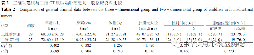 结果2.1 2组患儿一般临床资料比较 三维重建组纳入患儿29例(53.70%),二维CT组纳入患儿25例(46.30%)。本研究中2组患儿初诊时以咳嗽起病19例,发热9例,咳嗽并发热7例,腹痛、胸痛、咯血、查体发现各3例,喘憋2例,呕吐、车祸伤、产前B超、双下肢无力、Honor征各1例。其中13例患儿进行了胸腔镜下纵隔肿瘤切除术,均为三维重建组。2组患儿随访时间为(38.24±23.55)个月,均存活。其余一般临床资料差异均无统计学意义(均P>0.05),见表2。