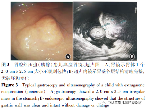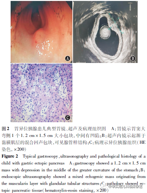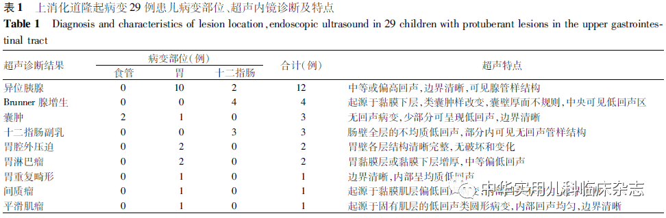 讨论超声内镜探头包括微探头、环型及扇型探头。微探头超声内镜具有超声频率高、成像清晰、小巧灵活、适用面广等特点,尤其适用于食管、胃、十二指肠等表浅部位病变的诊断及低年龄组儿童检查;此外,微探头超声内镜在发现病变的情况下,无需二次更换内镜,可有效降低操作损伤风险,更宜在儿童中应用。Attila等[2]对38例平均年龄13.5岁的儿童行上消化道超声检查(和/或超声引导下针吸活检)后发现,上消化道黏膜下病变主要包括胃溃疡1例、幽门前囊肿1例、胃囊肿1例、胃息肉1例、异位胰腺2例。本研究显示,在2 976例胃镜检查中,共发现上消化道隆起病变29例,检出率为0.97%,病种主要包括异位胰腺、Brunner增生、囊肿等,仅2例术后经病理证实为恶性淋巴瘤,提示此类病变儿童少见且主要以良性为主。异位胰腺是指生长在胰腺以外的孤立胰腺组织,拥有独立的血液供应和神经支配,可发生于消化道及腹盆腔任何部位,以胃及十二指肠最为多见,占总数的50%以上,患者年龄多为30~50岁,男性居多,儿童相对少见[3-4]。本研究显示,儿童上消化隆起病变以异位胰腺居多(41.4%),主要分布在胃窦部位,提示异位胰腺是儿童胃部最常见的隆起性病变,且异位胰腺分布特点与成人类似,儿童异位胰腺在上消化道隆起病变中所占比例目前尚无具体数据,考虑与儿童胃肠镜检查偏少有关。异位胰腺通常无明显临床症状或症状缺乏特异度,影像学上易与其他消化道肿瘤相混淆,目前超声内镜及CT是诊断异位胰腺最常用的影像学方法[4-6]。超声内镜下异位胰腺表现为边界模糊、腺管样结构、低回声或混合回声、可异位多层黏膜组织。有研究根据异位组织深度将异位胰腺超声下表现分为4种类型:单纯黏膜下型、黏膜下和黏膜层混合型、黏膜下和固有肌层混合型、完全混合型[7]。本组儿童异位胰腺病例微探头超声内镜特点为:边界清晰的类圆形结节,以均匀中等或偏高回声为主,部分病变内可见纤细管状结构,异位层次以黏膜下和黏膜层混合型多见,与成人异位胰腺超声内镜特点基本一致。异位胰腺缺乏特异性临床表现,术前诊断较困难,确诊需依靠病理检查。囊肿临床较为常见,为黏膜下非肿瘤性病变,其超声内镜主要表现为无回声病变,少部分可呈低回声。囊肿内部存在回声差异可能与囊肿内囊液黏稠度有关,临床上超声内镜无回声的囊肿,囊肿穿刺液为清亮透明液体,低回声表现的囊肿常含黏稠样分泌物,而无回声囊肿伴高回声碎屑则穿刺液为稠厚褐色液体或不能抽出囊液[8]。本研究显示囊肿部位主要发生在食管下段,微探头超声内镜表现为小的无回声病变,小的囊肿无需处理,可临床随访观察。本组患儿十二指肠黏膜隆起主要为Brunner腺增生和十二指肠副乳,二者分布位置有所不同,Brunner腺增生主要位于十二指肠球部,而十二指肠副乳则位于十二指肠降部。十二指肠副乳在常规胃镜下根据其位置和形态多可做出诊断,Brunner腺增生则较困难。Brunner腺增生微探头超声特点为起源于黏膜下层,类囊肿样改变,囊壁厚而不规则,中央可见低回声区;微探头超声内镜对Brunner腺增生的诊断有提示意义,但仍需与发生在十二指肠的异位胰腺相鉴别。Brunner腺增生可形成Brunner腺瘤,腺瘤常位于黏膜肌层以下,无明显包膜,直径可由数毫米至数厘米不等,但多数直径<1 cm[9]。Brunner腺瘤体较小时一般无临床症状和体征,当瘤体逐渐增大后则会产生相应的临床表现,主要为腹痛、腹胀、恶心、呕吐及黑便等症状,腹部查体可见压痛、振水声等体征。此类肿瘤儿童报道少见[10]。腔外压迫主要由邻近的正常脏器,如肝、脾、胰腺等组织压迫胃肠所致,超声内镜下表现为胃肠腔各层结构清晰完整,无破坏和变化。本研究中,2例腔外压迫均为胃镜下发现隆起病变而微探头内镜超声检查提示胃壁结构完整,压迫源于胃壁旁胰腺组织,体现了超声内镜对腔外压迫良好的诊断和鉴别作用,也提示对原因不清的隆起病变需常规加做微探头内镜超声。成人上消化道隆起病变以间质瘤和平滑肌瘤最常见,平滑肌瘤和间质瘤超声图像相似,内镜超声下不易鉴别[11-12]。本组患儿对此类病变诊断均为个例,最终诊断均依靠病理及免疫组化结果,提示儿童平滑肌瘤和间质瘤少见,考虑此类病种差异与年龄有关。重复胃畸形及淋巴瘤临床罕见,超声内镜对此有一定鉴别意义,虽然本组也有发现,但临床确诊仍需病理协助。有研究表明,超声内镜对上消化道黏膜下病变总体诊断的符合率为89.9%~98.5%[13-14]。本组患儿微探头超声内镜与病理诊断总符合率为93.3%,提示微探头超声内镜对儿童上消化道黏膜下病变同样具有较高的定位及定性诊断价值。所有行微探头超声内镜检查的患儿除1例在静脉麻醉检查中出现误吸引发呛咳外,余均无并发症(黏膜损伤、出血、穿孔等)发生,说明该检查对于儿童安全可靠。患儿微探头超声扫查过程中的误吸可通过调整体位、注水量及气管插管(必要时)等措施避免。当然,微型探头也有一定的局限性,主要体现在:(1)探查范围偏小(2 cm左右),对较大的病灶显示效果不够理想;(2)不能实施超声引导下的穿刺活检;(3)穿透力相对较弱,对炎症修复瘢痕的组织难以诊断,也难以定性诊断周围淋巴结大。总之,微探头超声内镜对儿童常见的上消化道隆起病变具有良好的诊断及鉴别作用,可避免盲目的穿刺和切除治疗。该检查应用于儿童安全可靠。