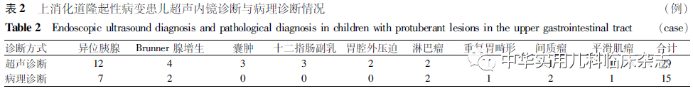 资料与方法1.1 一般资料 回顾性研究。收集2018年1月至2021年6月在济南市儿童医院消化科完成胃镜检查发现上消化道隆起病变并行微探头超声内镜扫查的患儿29例(同期共行胃镜检查2 976例),其中男17例,女12例;年龄3~16岁[(6.23±3.18)岁]。纳入标准:(1)0~16岁;(2)因腹痛、呕吐等上消化道症状行胃镜检查发现上消化道隆起病变,随后行微探头超声内镜扫查。排除标准:(1)年龄>16岁;(2)排除食管狭窄、幽门梗阻等其他上消化道疾病者;(3)具有麻醉和/或胃镜检查禁忌证者。剔除囊肿、外压及十二指肠副乳等14例,余15例患儿根据病情分别行深挖活检、内镜下治疗或外科手术治疗,术后行病理学检查。本研究通过山东大学齐鲁儿童医院医学伦理委员会批准(批准文号:QLET-IRB/T-2021033),患儿监护人均知情同意,并签署知情同意书。1.2 方法1.2.1 主要器械 Olympus 公司(日本)EVIS-260 型电子胃镜、EU-M2000 型超声主机、UM-2R 微型超声探头,包括有12 mHz、20 mHz 两种频率。1.2.2 临床资料分析 回顾性总结分析胃镜检查发现上消化道隆起病变并行微探头超声扫查患儿的消化内镜检查、治疗和/或病理组织学检查结果,计算微探头超声内镜对儿童上消化道隆起病变诊断的符合率,并评估该检查的安全性。观察项目:超声内镜检查结果,包括隆起病变分布、超声内镜特点、诊断等;超声内镜与病理诊断情况;并发症情况,包括误吸、黏膜损伤、出血、穿孔等。1.2.3 微探头超声检查 术前常规禁食、禁水6 h,建立静脉通道,在心电监护下,麻醉师静脉滴注丙泊芬(2~3 mg/kg)进行麻醉,根据病变位置决定是否行气管插管。患儿取左侧卧+头高脚低位,微探头采用水浸法,排除气体干扰,并于距离病变部位2~3 mm处行360°连续旋转扫描,了解病变范围、层次、起源、回声特点、与周围脏器及毗邻关系等。1.2.4 治疗方案 根据超声内镜结果选择不同治疗方案:腔外压迫及十二指肠副乳不予处理;囊肿定期随诊;其余分别采用内镜下黏膜切除术、内镜黏膜下剥离术治疗。1.3 统计学处理 应用统计学软件SPSS 16.0进行统计分析,计量资料以x̄±s表示,计数资料以例(%)表示。