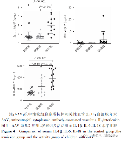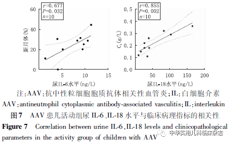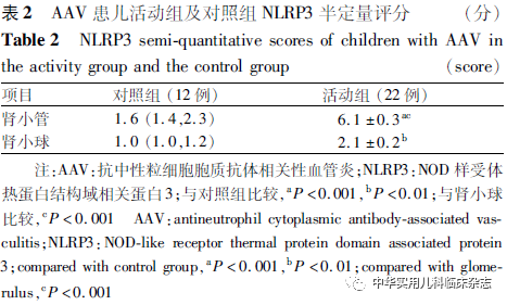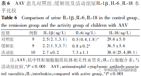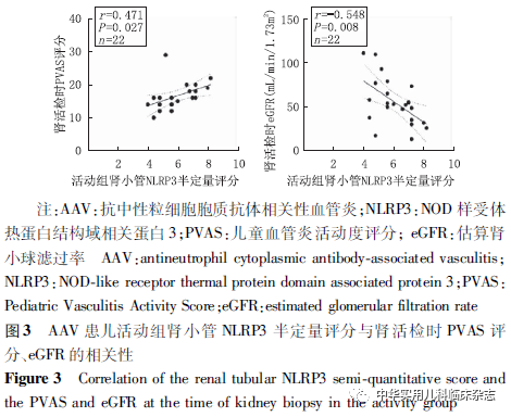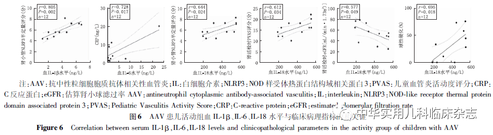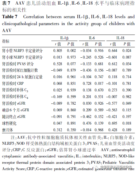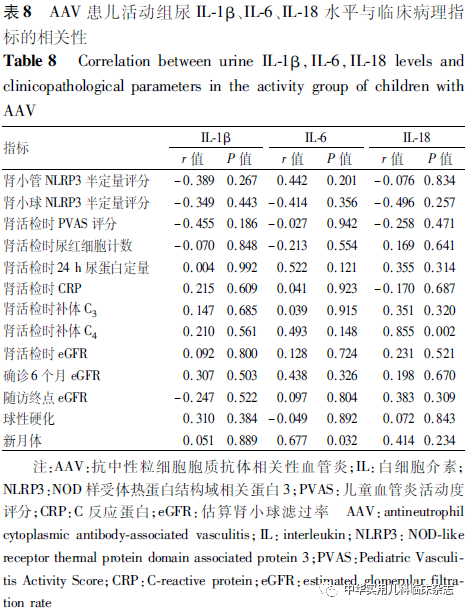 讨论NLRP3炎症小体作为炎症反应的核心,参与了2型糖尿病、系统性红斑狼疮、类风湿性关节炎等多种疾病,但其在儿童AAV中的作用尚不完全清楚。Tashiro等[10]报道,在MPO-ANCA相关性肾炎成人患者中,巨噬细胞严重浸润区可检测到NLRP3炎症小体,但在肾小球中缺失或仅轻微表达。本研究中,NLRP3炎症小体广泛表达于肾小管间质,而肾小球中表达量较少,且活动组的表达强度显著高于对照组,表明NLRP3炎症小体于AAV患儿的肾组织中表达,且主要表达于肾小管间质,与既往成人研究一致。进一步发现活动组肾小管NLRP3半定量评分与肾活检时患儿PVAS评分呈正相关,与eGFR呈负相关,提示NLRP3炎症小体的表达量与患儿疾病活动度及肾功能有关,NLRP3 炎症小体可能在AAV的发病中起作用。Wang等[11]的研究显示NLRP3 在成人AAV患者肾组织中的水平与临床病理指标间并无相关性,这可能是成人与儿童患者的不同之处,但需要扩大样本量进一步研究。除NLRP3炎症小体外,其下游IL-1β、IL-6、IL-18也可能参与了AAV的发病。Schreiber等[14]的研究表明,阻断IL-1β受体可改善MPO-ANCA小鼠的疾病状态,提示阻断IL-1β受体可能是一种有前景的AAV治疗策略。Anakinra是一种天然IL-1β受体拮抗剂的非糖基化重组形式,可阻断NLRP3炎症小体依赖的IL-1β信号,目前已成功应用于2型糖尿病、石棉肺和其他疾病的治疗[15]。Tocilizumab是一种拮抗IL-6受体的单克隆抗体,已被批准用于巨细胞动脉炎的治疗。有研究报道,17例成人AAV患者在接受Tocilizumab治疗后,88.2%的患者达到缓解[16]。然而,由于NLRP3炎症小体定位于巨噬细胞,常规方法较难检测,因此通过检测NLRP3炎症小体下游IL-1β、IL-6、IL-18来探究其与儿童AAV的发病及与疾病活动之间的关系也具有重要意义。本研究结果显示,活动组血IL-1β和IL-18水平均与NLRP3 半定量评分呈正相关,提示IL-1β、IL-18可能也在AAV的发病中起作用。本研究还发现活动组血IL-1β、尿IL-6、血IL-18 水平均高于缓解组和对照组,O′Brien 等[17]在成人AAV患者中发现血清IL-1β、IL-18水平高于对照组;Matsumoto等[18]在成人AAV患者中发现血清IL-1β、IL-6水平高于对照组,提示成人或儿童患者血、尿IL-1β、IL-6、IL-18可间接反映AAV的疾病活动状态,可作为评估疾病活动的参考指标。活动组血IL-6、IL-18水平分别与肾活检时CRP、PVAS评分存在相关性,提示AAV患儿血IL-6、IL-18可能与疾病活动度有关;血IL-18水平与球性硬化比例呈正相关,提示血IL-18可能与AAV患儿的肾脏病理进展有关;血IL-18水平与肾活检时eGFR值呈负相关,提示血IL-18升高可能与AAV患儿的肾功能进展有关。Matsumoto等[18]在成人AAV患者中发现,血清IL-1β、IL-6、IL-18水平与疾病状态同步变化,且与患者CRP、ANCA滴度、PVAS评分等临床指标存在相关性;Borgmann 等[19]在成人AAV患者和正常对照组中检测了IL-1β的基因,结果显示相较于对照组和未进展至终末期肾脏病的AAV患者,进展至终末期肾脏病的AAV患者IL-1β的基因表达显著增加,这些结果与本研究结果类似,表明IL-1β、IL-6、IL-18可间接反映AAV的疾病活动状态,可作为疾病活动评估的参考指标之一。本研究也存在一定的局限性。首先,本研究的样本量较少,拟扩大样本量后进一步探究NLRP3炎症小体在AAV中的作用。其次,本研究只进行了组织学实验,拟从细胞层面、动物层面进一步探究NLRP3炎症小体在AAV中的作用机制。综上所述,本研究中,NLRP3炎症小体多表达于AAV患儿肾小管间质,活动组肾小管NLRP3半定量评分与肾活检时患儿PVAS评分呈正相关,与eGFR呈负相关,提示NLRP3炎症小体参与AAV的发病和进展。AAV患儿血、尿IL-1β、IL-6、IL-18水平可间接反映AAV的疾病活动状态,可作为疾病活动评估的参考指标之一。