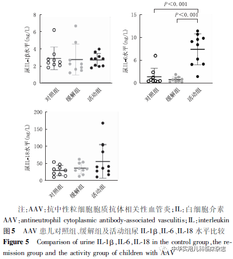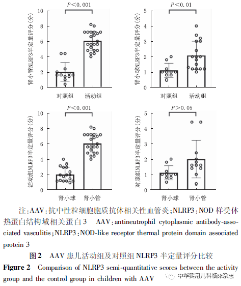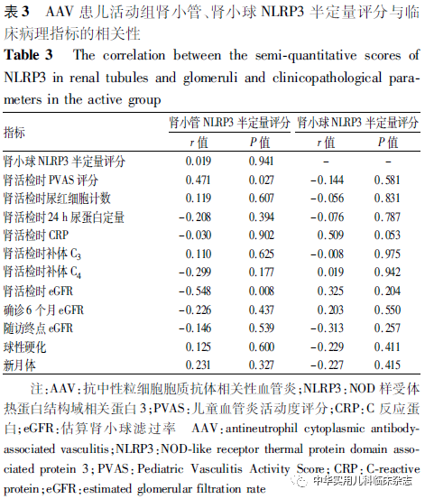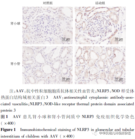 资料与方法1.1 样本来源 回顾性研究。收集中山大学附属第一医院小儿肾脏风湿病中心2003年9月至2020年9月诊断并行肾活检的1~18岁原发性AAV患儿资料。AAV的诊断符合2012年Chapel Hill 共识会议AAV诊断标准[12]。本研究经中山大学附属第一医院医学伦理委员会批准[批准文号:伦审(2021)529],患儿监护人均知情同意。1.2 方法 收集患儿性别、年龄、标本留取时间、肾活检时临床和病理指标包括24 h尿蛋白定量、尿红细胞计数、C反应蛋白(CRP)、补体C3、C4水平、儿童血管炎活动度评分(Pediatric Vasculitis Activity Score,PVAS)、肾活检时估算肾小球滤过率(estimated glomerular filtration rate,eGFR)、治疗6个月时及随访终点的eGFR、肾组织球性硬化比例、新月体比例。将所有儿童分为病例组和对照组,病例组再分为活动组和缓解组。缓解定义为患儿肾功能、尿检指标稳定,肾外体征改善或趋于稳定,无进行性恶化且PVAS评分≤5分;活动定义为患儿PVAS评分>5分且不符合上述指标中的任意一项[13]。活动组均取初诊肾活检时留取的标本,肾组织标本留取时间为2003年9月至2020年9月,血尿标本留取时间为2015年9月至2020年9月。缓解组缓解期无肾组织标本,血尿标本留取时间同活动组。对照组为同期肾移植科正常供肾肾组织标本及门诊体检健康儿童的血尿标本。在肾活检时收集患者肾组织标本并制成石蜡块,采用免疫组织化学法检测肾组织中NLRP3炎症小体的定位并进行半定量评分,NLRP3多克隆抗体购于美国 Novus Biologicals 公司。活动期患儿于肾活检时静脉采血1次,注入用肝素钠浸润过的1.5 mL的离心管内,并留取当日尿;缓解期患儿静脉采血1次,留取方法同上,并留取当日尿;对照组取体检后剩余的血液标本及尿标本。所有标本4 ℃静置2 h,离心机3 000 rpm,离心半径195 mm,4 ℃,离心 10 min 后分离血清和尿上清液,保存于-80 ℃冰箱。采用酶联免疫吸附试验(ELISA)检测血、尿中IL-1β、IL-6、IL-18水平,ELISA试剂盒购于美国安迪公司,并按照试剂盒说明书进行操作。1.3 半定量评分 NLRP3炎症小体阳性表达为细胞膜或胞质内呈现棕黄色颗粒。每例镜下随机采集5个视野(×400),以镜下阳性细胞百分比和染色强度的乘积为最终评分,分别观察肾小管间质和肾小球。(1)染色细胞占细胞总数百分比<5%计为0分;5%~25%计为1分;26%~50%计为2分;50%~75%计为3分;>75% 计为4分。(2)未染色计为0分;浅黄色计为1分;棕黄色计为2分;褐色计为3分。(3)两者相乘即为最终半定量评分。1.4 统计学处理 使用SPSS 25.0软件进行统计分析,使用GraphPad Prism 8.0软件进行绘图制作。正态分布的计量资料以x̄±s表示,两组间比较采用t检验,多组间比较采用单因素ANOVA检验;非正态分布计量资料以M(Q1,Q3)表示,采用Wilcoxon符号秩和检验比较。分类变量以百分比表示,采用χ2检验比较。采用Pearson相关系数或Spearman秩相关系数分析变量间相关性。P<0.05为差异有统计学意义。