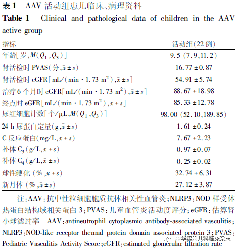 结果2.1 AAV患儿肾组织中NLRP3炎症小体的定位及表达2.1.1 一般资料 AAV活动组共纳入22例患儿,中位年龄9.5(7.9,11.2)岁,其中男2例、女20例,男女比例1∶10,见表1;对照组共12例,其中男2例,女10例,男女比例1∶5。