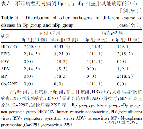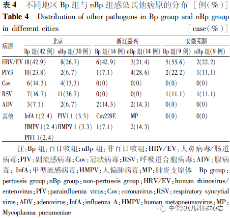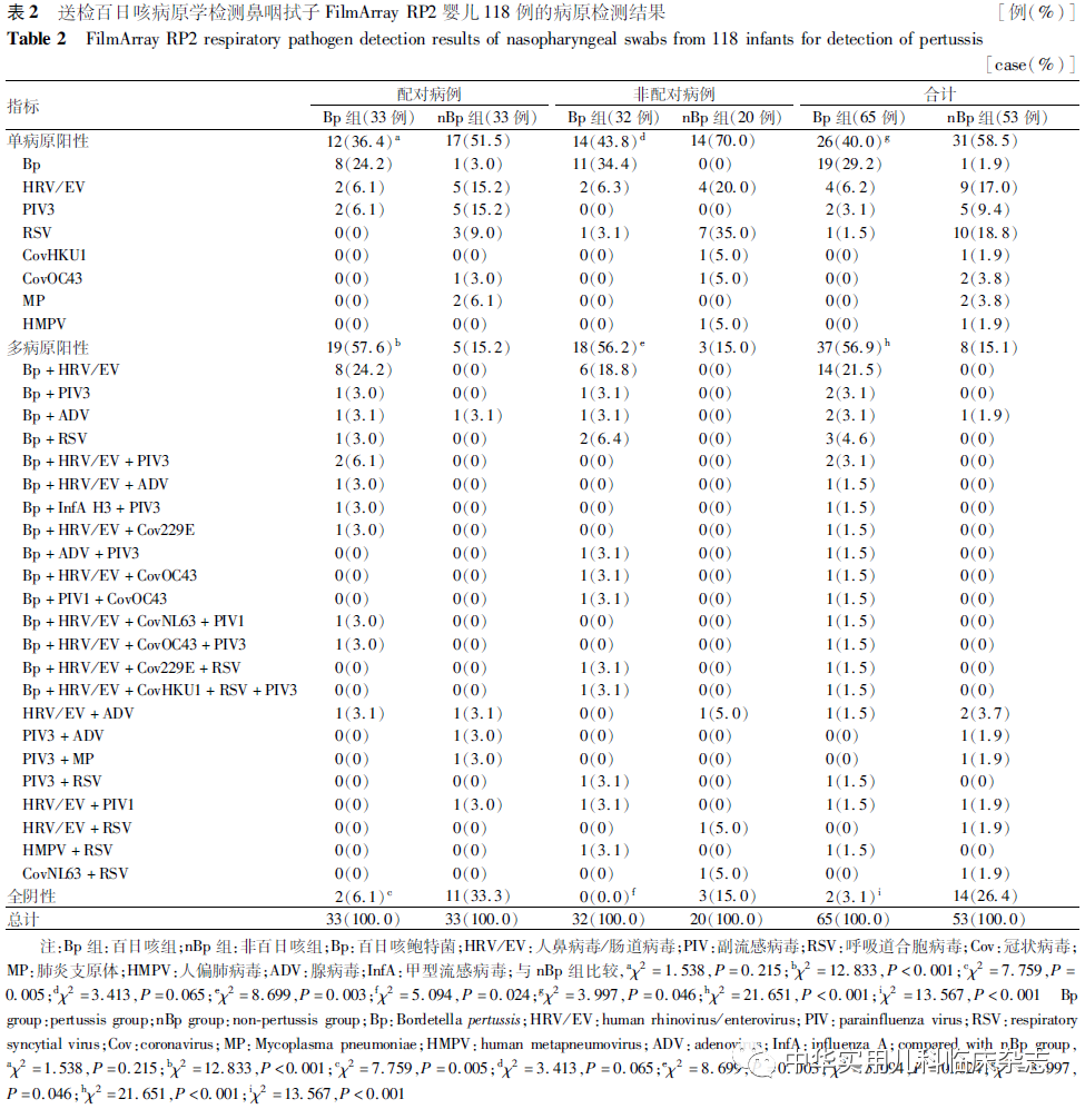 资料与方法1.1 研究对象 采用病例对照研究,纳入2018年8月至2021年1月北京儿童医院、嘉兴市妇幼保健院和芜湖市第一人民医院临床申请百日咳病原学检测的婴儿鼻咽拭子共118例,根据百日咳病原学检测[Bp细菌培养和荧光定量聚合酶链反应(PCR)检测]结果分为2组,Bp细菌培养或荧光定量PCR检测阳性为百日咳组(Bp组,65例);2种检测结果均阴性为非百日咳组(nBp组,53例)。118例中33对病例按相同月龄、发病季节、地市进行了严格配对;其余52例均为北京儿童医院采样的婴儿病例,未严格配对月龄和发病季节。所有婴儿鼻咽拭子应用FilmArray RP2检测呼吸道感染病原体,同时收集婴儿性别、年龄、采样时病程、住院时间等临床资料。入组标准:(1)临床医师申请百日咳病原学检测的患者;(2)年龄<1岁;(3)无先天畸形、先天性心脏病、遗传代谢性疾病或应用免疫抑制剂。本研究通过首都医科大学附属北京儿童医院医学伦理委员会批准[批准文号:(2019)-Y-012-B],并豁免知情同意。1.2 研究方法 1.2.1 Bp细菌培养 采集鼻咽拭子后即刻床旁接种,以拭子反复“Z”字形划线接种于碳琼脂选择培养基,置于37 ℃孵箱培养。细菌鉴定方法参见既往研究[1]。鼻咽拭子在接种后放置于-70 ℃冰箱保存,后期进行统一PCR检测。1.2.2 荧光定量PCR检测 采用北京卓诚生物科技有限公司产品:肺炎支原体(MP)/百日咳杆菌核酸检测试剂盒(PCR荧光探针法)进行检测。实验步骤按照试剂盒说明书进行操作。结果判定标准参照试剂盒说明书:检测通道无扩增曲线判为百日咳阴性,检测通道有扩增曲线且Ct值<40判为百日咳阳性。1.2.3 FilmArray RP2检测 取出-70 ℃冰箱冻存的鼻咽拭子,室温放置平衡温度10~15 min,然后按生物梅里埃公司生产的呼吸道感染性病原体核酸检测试剂盒(封闭巢式多重PCR熔解曲线法)(RP2),即FilmArray RP2检测说明进行操作。FilmArray RP2可检测的病原体包括ADV、冠状病毒(Cov)(229E、HKU1、NL63、OC43)、人偏肺病毒(HMPV)、HRV/肠道病毒(EV)、甲型流感病毒(InfA)(H1亚型、H1-2009亚型、H3亚型)、乙型流感病毒(InfB)、PIV(1型、2型、3型、4型)、RSV、MP、肺炎衣原体(Cpn)、Bp、副百日咳鲍特菌(Bpa)。1.2.4 结果定义 在本研究中,单病原阳性指FilmArray RP2检测结果中仅有1种病原为阳性;多病原阳性率指FilmArray RP2检测结果中有≥2种病原阳性例数占相应检测例数的比率,上述指标均不考虑分组所依据的Bp细菌培养和荧光定量 PCR 检测结果。混合感染指有任意2种以上病原阳性。1.3 统计学处理 采用SPSS 26.0软件进行统计学分析。计数资料以例(%)表示,组间比较采用χ2检验,P<0.05为差异有统计学意义。