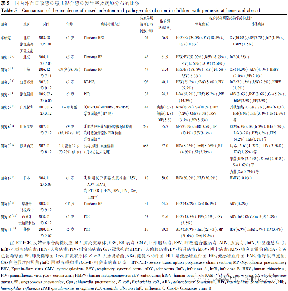 讨论既往研究报道,百日咳混合其他病原体感染时,百日咳临床表现可能缺乏其典型特征,且易发生肺炎等并发症[6],Bp单纯感染和混合感染婴儿临床轻重程度无明显差异,但混合感染者咳嗽持续时间更长,血常规中白细胞、淋巴细胞值更易升高,重症患者住院时间更长[8,18-19]。相较于Bp单纯感染,混合感染婴儿更易出现发绀[20]。因此应加强百日咳混合感染病原监测。本研究显示婴儿百日咳混合其他病原感染率为56.9%,混合感染病原以HRV/EV检出为主,PIV、RSV、Cov次之,其他混合感染病原为ADV、InfA、HMPV。近十余年来国内外有关百日咳混合感染状况报道较多,百日咳患儿常混合其他病原,包括病毒、细菌、不典型病原体和真菌感染,但基于不同研究对象、方法、年份的混合感染率差异较大(31.6%~94.3%)[5-16](表5),不同报道中常见混合感染病原因而有所不同,HRV常是第1位的混合感染病毒[6-8,14-15],也有显示最常见混合感染病毒为RSV[12-13]。