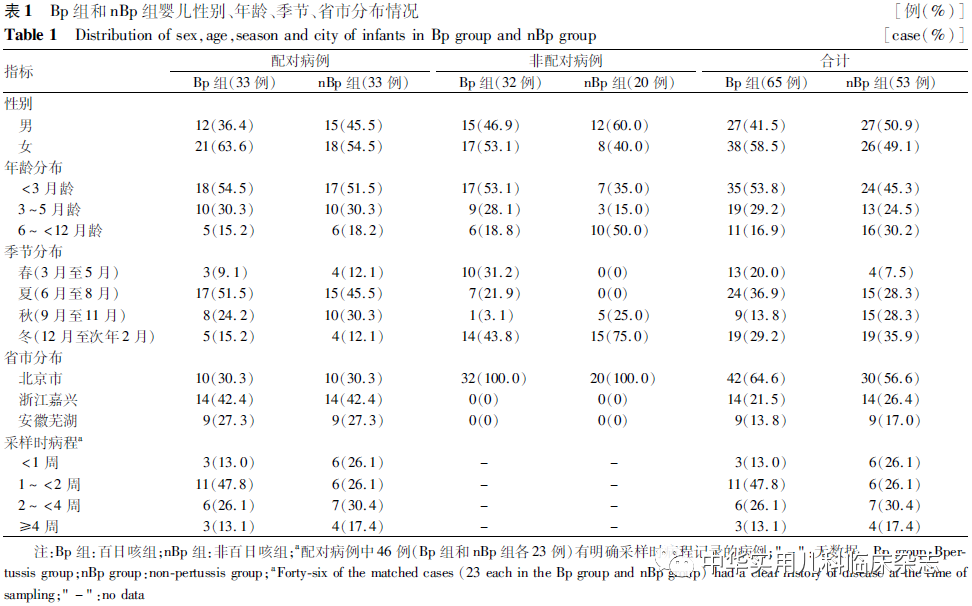 结果2.1 Bp病原检测结果 Bp细菌培养阳性46例,MP/百日咳杆菌核酸检测试剂盒检出Bp PCR阳性59例,两者同时阳性40例,单纯Bp细菌培养阳性6例,单纯Bp PCR阳性19例,故本研究Bp组65例,nBp组53例。2.2 一般情况 本研究中Bp组和nBp组婴儿性别、年龄、季节、省市分布情况见表1。33对配对病例按月龄、季节、地市进行严格配对,Bp组和nBp组性别差异无统计学意义(P>0.05),其中23对配对病例有明确的采样时病程天数记录,Bp组采样前病程1~<2周患者最多,占比47.8%,nBp组采样前病程2~<4周患者最多,占比30.4%,其时间分布在Bp组和非Bp组差异无统计学意义(P>0.05)。非配对病例均来自于北京,Bp组与nBp组性别差异无统计学意义(P>0.05);月龄和发病季节分布有所不同,Bp组患儿以<3月龄婴儿为主(53.1%),3~5月龄次之(28.1%),<6月龄婴儿共占比81.2%,6~<12月龄婴儿最少(18.8%),nBp组患儿以6~<12月龄婴儿最多(50.0%),其次为<3月龄(35.0%),3~5月龄婴儿最少(15.0%),Bp组与nBp组6~<12月龄婴儿差异有统计学意义(χ2=5.642,P=0.018);Bp组与非Bp组春(χ2=7.738,P=0.005)、夏(χ2=5.056,P=0.025)、秋(χ2=5.770,P=0.016)、冬(χ2=4.873,P=0.027)四季差异均有统计学意义,Bp组冬、春季节为主,非Bp组以秋、冬季节为主。总体来说(包括配对病例和非配对病例),Bp和nBp组之间,性别、月龄、发病季节和地市分布差异均无统计学意义(均P>0.05)。