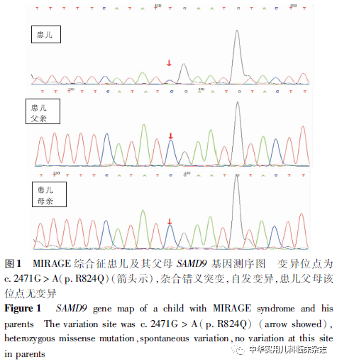 临床资料1.1 一般资料 患儿,男,11个月,因“间断发热1.5个月,血氧下降0.5 d”于2020年6月收入深圳市儿童医院呼吸科。既往史:患儿出生后因“反复吸入性肺炎、反复细菌感染、慢性腹泻病”在深圳市儿童医院和外院多次住院及门诊治疗。出生时有“新生儿肺透明膜病、支气管肺发育不良、高钾血症、低钠血症、血小板减少、贫血、动脉导管未闭”病史。出生史:患儿系第3胎,第2产,31+5周因“胎儿生长受限,胎儿窘迫”行剖宫产娩出,出生体质量1 290 g,出生身长50 cm,Apgar评分(1 min 9分,5 min和10 min 均10分),无胎膜早破,胎盘无异常。喂养史:出生后间断鼻饲母乳及配方奶。生长发育史:全面发育落后。预防接种史:仅接种1剂次乙肝疫苗。家族史:家族中无类似病史,有一个6岁姐姐,体健,母亲因“葡萄胎”流产1次。入院查体:体温37.0 ℃,心率174次/min,呼吸60次/min,体质量8 kg,身高72 cm,头围40 cm,血氧饱和度0.96(1 L/min鼻导管吸氧条件下)。耳位稍低,鼻梁低,高颚弓,双手通贯掌,全身皮肤无色素沉着及多毛。咽部稍充血,扁桃体无肿大。气促,三凹征阳性,双肺呼吸音粗,可闻及散在细湿啰音。心脏查体未见异常,腹软,肝脾肋下未及肿大,肠鸣音活跃。四肢活动正常,四肢肌张力正常。尿道下裂、小阴茎,双侧睾丸位于阴囊内。1.2 辅助检查 肝肾功能、心肌酶、电解质、体液免疫、血尿筛查、凝血功能、血气分析、痰培养、病原学(细菌、肺炎支原体、沙眼衣原体、病毒、真菌、结核杆菌、百日咳杆菌)、肾上腺皮质激素六项、甲状腺功能八项、心电图、心脏超声、肝胆胰脾超声、泌尿系统超声、肾上腺超声、性腺超声、颅脑磁共振成像(MRI)均未见明显异常。胸部CT示肺炎。上消化道造影示口腔期轻度、咽期重度吞咽功能障碍。1.3 临床诊治 入院后予哌拉西林钠他唑巴坦钠[100 mg/(kg·次),每8 h 1次]静脉滴注抗感染,9 g/L氯化钠(2 mL)+布地奈德(2 mL)雾化化痰,2次/d,吸痰,低流量吸氧(1 L/min),鼻饲配方奶喂养,益生菌调节肠道菌群及支气管镜检查和肺泡灌洗等治疗。好转出院。1.4 基因检测 核型检查:染色体46,XY22pstk+。患儿外院已行全外显子测序,结果为SAMD9基因(NM_017654)杂合变异,变异位点为c.2471G>A(p.R824Q),为错义突变,该变异为自发变异,既往已报道[13](图1)。