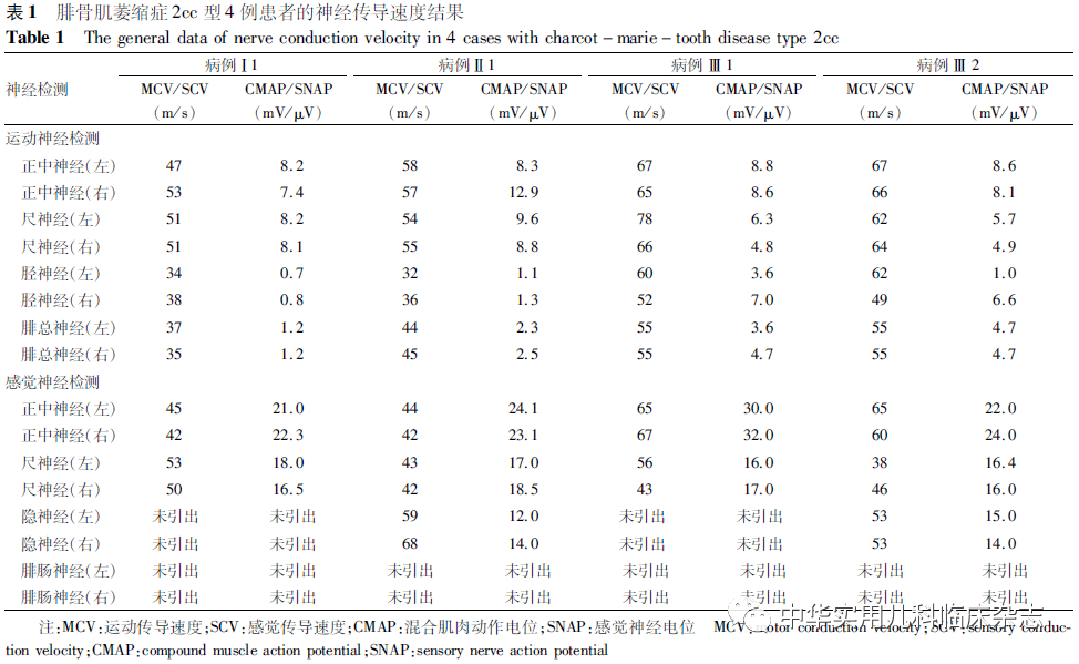 腓骨肌萎缩症(charcot-marie-tooth,CMT)是一组同时累及运动、感觉神经的遗传性疾病。人群中发病率为30.08/10万[1],临床表现以对称性肢体远端肌肉进行性无力萎缩,无或仅有轻微的感觉障碍,高弓足、槌状趾、爪形手等为主要特征,起病隐匿,多数进展缓慢[2]。国际上根据上肢运动神经传导速度(motor nerve conduction velocity,MNCV)结合病理改变将其分为脱髓鞘型(CMT1,MNCV<38 m/s)、轴索型(CMT2,MNCV>38 m/s)和中间型(ICMT,35<MNCV≤45 m/s)3种类型[3]。CMT2cc型患儿临床表现以锥体束损伤为主,如未能及时行电生理检测,易被误诊为脑性瘫痪。本研究报道2020年3月来天津市儿童医院康复科就诊的一个家系4例患者的临床特征、电生理检测、血生化及基因检测结果,旨在进一步提高对该病的认识。