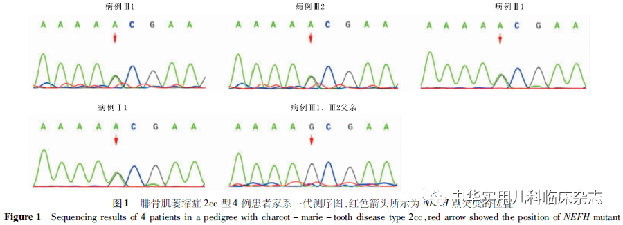 讨论Charcot、Marie及Tooth最早发现一类以双下肢感觉、运动神经受损为主的疾病,并命名为CMT。之后发现该病与遗传有关,是神经系统常见的遗传性疾病之一,其遗传方式多样,可呈常染色体显性遗传、常染色体隐性遗传和X-连锁遗传, MFN2、GDAP1、MPZ、GJB1和HSPB1是其常见致病基因。2016年Rebelo等首次报道NEFH基因2个移码突变致淀粉样毒蛋白聚集,表现为轴突型,称为CMT2cc型[4],临床表现以下肢运动症状为主,可波及近端肌肉[5]。本研究是国内首次报道NEFH基因致合并锥体束征及VEP检测异常CMT2cc型。本研究家系4例患者均有上运动神经元症状、双侧跟腱挛缩、高弓足,远端肌肉萎缩,肌电图检测示双下肢运动神经传导CMAP下降,双下肢腓肠神经感觉神经检测均未引出明确波形。4例患者无论发病时间长短,均未累及双侧上肢,结合基因检测结果诊断CMT2cc型,该家系每一代均有患者,男女均有发病,分析为常染色体显性遗传。三代人发病年龄越来越早,临床症状也越来越重,与以往研究[6]发现一致。研究发现,CMT2cc患者血清肌酶会增高[7],本研究4例血清肌酸激酶均未增高。CMT患者有高度临床异质性,易合并其他系统病变,一些CMT患者会合并锥体束症状[8],本研究该家系符合上述研究。先证者在就诊过程中临床主要以锥体束征为突出表现,行头颅MRI未见异常,在寻找病因的过程中行NCV+EMG发现存在双下肢感觉运动神经轴索病变,由此为线索发现该病。因这类患者以锥体束征为主,易被误诊为其他疾病,临床上遇到此类患者需警惕是否合并周围神经损害。本研究4例患者VEP均异常,视力及眼底检测无异常,临床未出现明显视力、视野障碍。Vizioli在1889年首次发现CMT合并视神经病变,特别是在CMT2A型中更多见[9],CMT合并视神经病变临床症状存在较大变异,同一个家系视神经受累的程度差别较大,一些患者还可能出现视力的自发改善,临床上其他疾病也可出现无视觉障碍的亚临床视觉损害[10]。本研究病例 Ⅰ 1 发病31年,目前尚未出现视力问题,需要加强后期随访,定期进行视力检测以便能及时发现异常,也有可能NEFH基因变异致CMT2cc患者仅存在VEP检测亚临床异常,这些均需后期进一步印证。NEFH基因(OMIM#162230)定位于22q12.2,其表达产物是神经丝的组成部分之一,神经丝是神经元中唯一表达的一类中间丝,为轴突细胞骨架的主要组成部分,对轴突的生长、轴突直径的维持以及电冲动沿轴突的传导具有非常重要的作用,中枢和外周神经中均有表达。NEFH突变会引起神经元胞体出现异常淀粉样聚集,这种变化也是肌萎缩性侧索硬化症(ALS) 的典型病理改变,近期研究发现,NEFH发生移码突变导致终止密码子缺失,3′UTR中延长的氨基酸会编码与ALS病理改变相似的纤维淀粉样物质,引起突变型蛋白在胞质出现异常聚集[11]。本研究4例患者为NEFH基因(c.1319G>A)错义突变,导致周围感觉、运动神经及锥体束受损,具体作用机制目前尚不清楚。针对CMT2cc型患者目前尚无有效的药物治疗,根据功能障碍的状况,采用综合的康复治疗来提高其生活质量,如运动疗法、Motomed、蜡饼疗法、水疗配合辅助支具等改善行走、平衡问题。通过穿戴踝足矫形器可使踝关节挛缩、髋关节的代偿性动作均得以改善,提高患者的生活质量。本组4例患者随访1年病情较前无显著变化,可以继续随访。综上,本研究首次报道了NEFH基因c.1319G>A(p.Ser440Asn)突变位点,充实了CMT2cc基因库,并首次发现该家系患者同时存在临床下VEP检测异常。临床上这类患者同时合并锥体束征,且以其为主要临床表现,提示在遇到上运动单位症状患者时,需考虑是否合并周围神经病变。