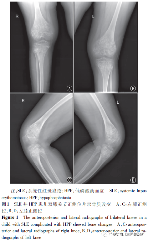 临床资料1.1 病史与体格检查 回顾性分析。患儿,男,10岁,因“发热伴颜面皮疹4 d”于2015年12月收治于吉林大学第二医院儿科。入院前4 d患儿无明显诱因出现发热,体温最高38.9 ℃,伴颜面皮疹,自行口服“头孢”3 d,仍有发热。病程中患儿出现单个手指肿痛,无光过敏。既往3岁时因口腔牙齿脱落、行走困难于吉林大学第二医院及北京某医院行肝/骨/肾型碱性磷酸酶(ALPL)基因检测确诊为HPP,无食物、药物过敏史,身高较同龄儿矮小,父母非近亲结婚,家族中无遗传病史及其他特殊记载。入院时体格检查:体温38.0 ℃,脉搏100次/min,呼吸25次/min,血压110/60 mmHg(1 mmHg=0.133 kPa),身高130 cm,体质量43 kg,一般状态可,行走缓慢似鸭步,面色略苍白,双侧面颊部皮肤可见多个米粒大小暗红色皮疹,不凸出皮面,压之不退色,口腔内侧可见2处溃疡,牙齿部分缺如,仅见8颗恒切牙及4颗恒磨牙。心肺腹及神经系统查体未见明显异常,四肢关节无红肿、无压痛。1.2 辅助检查 血常规示白细胞3.2×109/L、中性粒细胞1.00×109/L、淋巴细胞2.10×109/L、血红蛋白88 g/L、血小板98.0×109/L,尿常规示蛋白质(+),红细胞沉降率40 mm/1 h,肝功能示白蛋白37.8 g/L、ALP 17 U/L,肾功能示肌酐88.0 μmol/L、尿素氮13.59 mmol/L、尿酸455 μmol/L,血离子示钙 2.33 mmol/L、磷2.01 mmol/L,余项生化检查未见异常,便常规、C反应蛋白、降钙素原、血脂、空腹血糖未见异常。抗核抗体(ANA) 1∶1 000,抗双链(ds)-DNA抗体、抗心磷脂抗体、抗干燥综合征抗原A(SSA)抗体均阳性,核周型-抗中性粒细胞胞质抗体(p-ANCA)阳性,直接抗人球蛋白试验(IgG+C3)弱阳性,免疫球蛋白G 21.30 g/L、补体C3 108.0 mg/L、补体C4 17.8 mg/L。乙肝病毒等多种病原检测未见异常。双膝关节正侧位片(图1)示双侧股骨下端、胫骨及腓骨上端骨质呈膨胀性生长,密度减低,其内可见小囊状透光区,关节间隙尚可。胸部CT示两肺间质性炎症。心电图、肝胆胰脾肾及心脏彩超未见异常。
