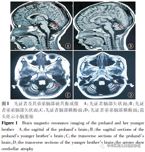 病例资料1.1 一般资料 回顾性分析,先证者,女,11岁,1岁6个月发现运动、语言较同龄人落后,不能独走,不会说话,予语言及运动康复治疗后,2岁左右开始能说简单词语、可独走,但步态不稳。现患儿仍走路不稳,认知、反应较同龄人慢,口齿欠清晰,能正常交流。既往史无特殊。患儿为第2胎,第1产,早产(35+3周)顺产,出生体质量2.4 kg,出生时无窒息史,无产伤、抢救史,Apgar评分不详。运动、语言发育落后,有学习困难。父母均体健,弟弟有类似病史。体格检查:身高150 cm(P50~P75),体质量35 kg(P25~P50)。神志清楚,构音障碍,心肺、腹部查体未见异常。无明显眼震或舌颤,四肢近端肌力4级,远端5-级,肌张力大致正常,指鼻不稳,摇摆步态,一字步不稳,膝反射活跃,下蹲起立困难,单双足跳不能完成,脑膜刺激征阴性。辅助检查:血清肌酸激酶(CK)131.1 U/L(参考值范围18~198 U/L),血常规、血氨、电解质、肝肾功能、心肌酶、同型半胱氨酸、乳酸、25羟基维生素D、甲状腺功能正常。胸片、腹部彩超正常。头颅磁共振成像(MRI)示小脑萎缩(图1)。肌电图示神经源性改变(运动神经CMAP波幅下降,针电极可见失神经电位)。眼科检查未发现异常。