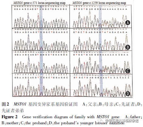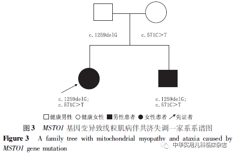 讨论线粒体是高度动态的细胞器,通过融合、分裂、运动和线粒体吞噬这些过程来维持细胞正常的生理功能。这些过程是由许多线粒体DNA(mtDNA)和基因组DNA(nDNA)编码的蛋白介导的,这些蛋白质的缺乏会导致线粒体融合受损(由MFN2、OPA1、 YME1L1、MSTO1和FBXL4的致病性变异引起)、线粒体裂变缺陷(由DNM1L和MFF的致病性变异引起)和线粒体自噬(由PINK1和PRKN的致病性变异引起),影响线粒体形态、分布和功能[10]。线粒体是通过氧化磷酸化为机体制造能量的一种细胞器,线粒体功能障碍会引起氧化磷酸化功能障碍,出现 ATP合成下降、无氧代谢增加、氧自由基产生过多和细胞凋亡,最终导致组织或器官出现异常的疾病[11]。MSTO1基因作为编码线粒体融合蛋白的基因,已被证实其致病变异与线粒体融合受损有关,但其确切机制尚不清楚[4]。由文献复习可得,常染色体显性遗传临床特征主要为肌病、共济失调、听力障碍、视力障碍、认知障碍、远端感觉不足、精神疾病(包括焦虑、自闭症、抑郁和精神分裂症)和内分泌病变(包括甲状腺功能亢进症、高泌乳素血症和维生素D缺乏症),可有身材矮小,关节松弛,大脑MRI显示的额叶萎缩或垂体腺瘤。常染色体隐性遗传MSTO1基因的双等位基因功能缺失致常染色体隐性变异的临床特征主要为肌病(包括肌肉无力,运动发育延迟,CK升高,肌电图中的肌病样改变以及肌肉活检的肌营养不良样改变)、共济失调、运动和语言发育迟缓、构音障碍、小脑萎缩和色素性视网膜病变等眼部改变,常婴儿期起病,常无严重的认知累及,但有学习困难,常有身材矮小。临床上需与α-抗肌萎缩相关糖蛋白(α-DG)相关先天性肌营养不良、SIL1的双等位基因变异引起的Marinesco-Sjogren综合征(MMSS)等相鉴别[4]。α-DG相关先天性肌营养不良表现为累及肌肉、脑及眼的早发性营养不良性肌肉疾病,通过免疫组织化学和免疫印迹检测α-DG可以鉴别。MSS的特征是智力障碍、白内障、肌病伴共济失调和小脑萎缩,通过基因检测可以鉴别[4]。在治疗上,绝大多数的线粒体肌病缺乏确切有效的治疗,主要集中于对症治疗,药物治疗多采用“鸡尾酒疗法”(维生素 B1、B2、B6、C、E、精氨酸、左卡尼汀、艾地苯醌、生物素等),其包含多种抗氧化剂和代谢相关辅助因子,可作用于线粒体能量代谢的各个环节[11-12]。其中艾地苯醌是辅酶Q10的一种合成类似物[13]。辅酶 Q10和艾地苯醌能清除氧自由基对细胞的损伤,因为辅酶 Q10是线粒体氧化呼吸链中复合酶 Ⅱ 的重要组成部分,能抑制脂质过氧化而具有抗自由基作用;辅酶 Q10和艾地苯醌还可参与线粒体氧化磷酸化反应,将电子传递给复合酶体Ⅲ,对于复合酶 Ⅰ或 Ⅱ 缺陷起到旁路传递电子作用,为细胞提供能量[12-13]。还可以辅以康复治疗、言语支持治疗等,有些患者需要长期依赖轮椅[2-9]。本例先证者及其弟弟表型包括肌肉无力、小脑共济失调、运动发育迟缓、言语延迟、构音障碍、学习困难。无身材矮小,CK正常,头颅MRI示小脑萎缩,眼部检查正常,此家系姐弟2例肌电图结果提示神经源性改变,且该家系病例属于常染色体隐性遗传致病。这些表型特征与文献报道[3-9]的携带MSTO1双等位基因变异的患者有很好的重合。基于该先证者及其弟弟的表型特性征和基因检测结果,诊断为MSTO1双等位基因变异所致的线粒体肌病伴共济失调。线粒体基因变异导致的线粒体肌病很常见,导致的周围神经病也并不少见。文献报道[3-9]的MSTO1基因变异的线粒体病患者多有肌无力和共济失调症状,肌电图多显示为肌源性改变,但本家系2例患儿肌电图均提示神经源性改变,提示MSTO1基因变异也可能导致周围神经损害,这与线粒体疾病可以影响各种组织,特别是能量消耗最多的组织(包括周围神经)有关,且大多数遗传性周围神经病变是无症状或亚临床性的[9]。本病例中c.1259delG变异已在2篇文献中进行报道,2个家系共4个病例出现此变异位点[3-4]。c.571 C>T变异尚未有MSTO1致病变异报道,在1 000 Genomes、ESP6500等数据库亦未见报道,但其在ExAC、GnomAD数据库中人群频率分别为0.000 232、0.000 277 047,是位于热点突变区域和/或位于无良性变异的关键功能域。c.571 C>T导致191位的精氨酸(Arg)突变为色氨酸(Trp),精氨酸为碱性氨基酸,而色氨酸为中性氨基酸,该点突变属于错义突变中的非保守型突变,氨基酸性质改变极有可能导致蛋白质的功能发生改变。结合此家系数据的遗传学证据表明c.571 C>T变异极有可能是新发现的MSTO1基因的致病突变位点。因本病缺乏有效根治方法,故予“鸡尾酒疗法”对症支持治疗,症状改善。综上所述,在临床上遇到有早期发作性肌病、共济失调、运动语言发育迟缓、构音障碍表现的患者时,特别是在有小脑萎缩的情况时,需考虑MSTO1基因变异所致的线粒体肌病伴共济失调,可以进行基因检测进行诊断。