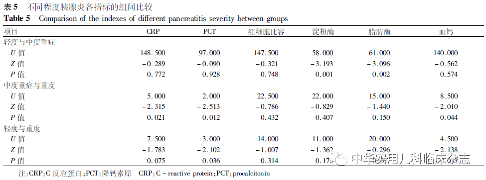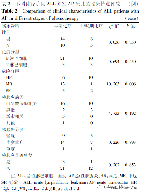 讨论AP的发生机制是胰腺腺泡细胞内胰蛋白酶的过早激活、腺泡细胞的破坏、伴随局部炎症,最终导致胰腺的自身消化。轻症患者可仅有腹部不适的表现,重症者可出现多器官功能衰竭,严重影响ALL患者预后。本研究中ALL并发AP发病率约为8.55%,多发生于化疗早期,尤其是AAP,这表明AAP与门冬酰胺酶剂量相关性小,可能与患者个体易感性存在关联[16]。AP的主要病因为门冬酰胺酶(尤其是培门冬酶)的使用,其次为糖皮质激素和感染。与AAP相比,激素相关胰腺炎多为轻中度胰腺炎。发生AP时,患者可有腹痛、腹胀、恶心、呕吐、腹泻等症状,也可无任何表现,其中最常见的症状为上腹部疼痛。不同危险分层的患者其治疗方案等不尽相同,他们发生胰腺炎的概率亦有不同[17-18]。通过进一步的多因素分析可知,与标危患儿相比,高危患儿更易患AP(OR=8.894,95%CI:1.889~41.885),说明危险度分层是ALL并发AP的危险因素之一。白蛋白由肝脏合成,是维持血浆胶体渗透压最主要的成分。本研究发现,病例组AP发生前患儿的白蛋白水平下降,这些患儿发生胰腺炎的风险远高于白蛋白水平正常的患者(OR=11.444,95%CI:3.240~40.423),但其具体机制尚不明确,需进一步探索。研究表明[19-20]高三酰甘油血症(>11.3 mmol/L)是胰腺炎的一个重要病因,而三酰甘油水平轻度升高(2~5 mmol/L)与AP发生的风险增加有关[21-22]。本组病例也得到了类似结论,三酰甘油轻度升高的ALL患儿易并发AP(OR=18.047,95%CI:5.020~65.074 )。本研究不同化疗阶段的胰腺炎患儿不具有性别、免疫分型、胰腺炎严重程度、复发风险的倾向性,二者的胰腺炎病因在统计学上亦未见明显差异,但可能与本研究样本数小有关,需要进一步大样本的研究。高危ALL患儿AP多发生在中晚期化疗阶段(62.5%,10/16例),而标危及中危ALL患儿主要于早期化疗阶段并发AP。因此,本研究还对不同危险分层的病因进行了比较,但差异无统计学意义(χ2=4.578,P=0.101),可能提示AAP与高危患儿中联合化疗的累积强度有关。发生AP时常有胰腺水肿、渗出、出血、坏死以及胰腺周围组织炎症等影像学表现,不同的影像学检查其敏感性各异。目前国内外胰腺炎指南[13-14]中多以腹部CT尤其增强CT作为胰腺炎诊断的金标准,但本研究结果显示,胰腺MRI敏感性较腹部超声及腹部CT更高。尽管胰腺MRI敏感性高,但其对患儿的配合度要求高,且不适合用于危急重症时,这可能是指南中没有把胰腺MRI作为主要诊断手段的原因。腹部超声简便快捷,费用相对低,但结果受操作者主观判断影响较大;腹部CT虽然对轻度AP敏感性不高,但其有助于对炎症反应及坏死程度的判断[23]。因此,临床上仍需根据不同的场景及需求进行选择。病例组中4例(10.3%)发生了假性囊肿,但无患儿死亡,这得益于对AP的早期干预[24]。本研究9例患儿再次接受门冬酰胺酶制剂的治疗,其中5例为轻度胰腺炎,4例为中度重症胰腺炎。应用门冬酰胺酶后4例出现了胰腺炎的复发,其中3例(75.0%)初发时为中度重型胰腺炎;而轻度胰腺炎仅1例(20.0%)复发,故对于轻度胰腺炎患儿,待胰腺炎恢复后可以考虑继续门冬酰胺酶制剂化疗,而中度重型及重型胰腺炎患儿不建议继续应用门冬酰胺酶制剂。本研究对不同胰腺炎程度的CRP、PCT、红细胞比容、淀粉酶、脂肪酶及血钙进行组间比较,结果表明CRP、红细胞比容、淀粉酶及脂肪酶与胰腺炎严重程度无明显相关性。PCT值越高或血钙值越低可能对重度胰腺炎有提示作用。但PCT受多种因素影响,在细菌、真菌感染及休克、全身炎症反应时也会出现升高,故应结合其他指标综合判断。综上所述,AP是ALL患者治疗过程中常见的并发症,高发于3~10岁ALL患儿,多发生在化疗早期,主要由门冬酰胺酶所致。激素相关胰腺炎程度多较轻,高危ALL患儿并发AP主要出现在中晚期化疗阶段。腹痛是ALL并发AP最常见的临床症状。胰腺MRI在AP的诊断中敏感性最高,腹部CT敏感性最低。对于轻度胰腺炎患儿可尝试再次应用门冬酰胺酶制剂。危险分层、白蛋白下降、三酰甘油升高是ALL并发AP的风险预警因素,PCT水平升高、血钙水平降低可能对重度胰腺炎有提示作用。通过监测上述指标,可使临床工作者对易并发AP的高危患儿进行早期识别,及早防治,从而改善ALL患儿的预后。本研究的不足之处:样本量小,且不满足EPV(Event Per Variable)的要求,因此结果有待扩大样本量后进一步证实。但考虑到该类患儿较为少见,且结果具有一定可解释性,仍对其进行展示。该结果的可靠性仍需进一步研究的确证。