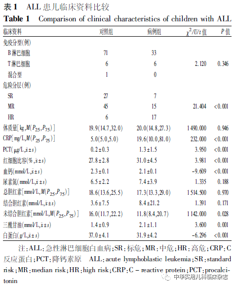 结果2.1 基本资料 共收治新发ALL 456例,ALL并发AP患儿39例作为病例组,发病率约为8.55%。其中男24例,女15例,男女比例为1.6∶1.0,年龄为2~13岁[(6.03±3.40)岁],其中3~10岁者占71.8%。对照组78例,其中男48例,女30例。病例组与对照组间在免疫分型方面差异无统计学意义(P>0.05),2组在危险分层分布、CRP、PCT、红细胞比容、血钙、未结合胆红素、三酰甘油、白蛋白水平比较差异均有统计学意义(均 P<0.05)(表1)。
