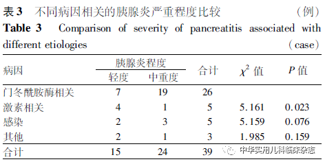资料与方法1.1 研究对象 回顾性研究。选取2018年5月至2020年12月首都医科大学附属北京儿童医院血液病中心ALL患儿在住院期间并发AP者39例作为病例组,同期按照同年龄、同性别1∶2完全匹配的方式按照简单随机抽样法选取78例ALL患儿作为对照组。纳入标准:(1)均符合ALL诊断标准,并严格按照形态学-免疫学-细胞遗传学-分子生物学(Morphology-Immunophenotype-Cytogenetics-Molecular Biology,MICM)进行分型诊断[11-12]。(2)均为初发ALL,并采用CCLG-ALL2018方案[11]治疗,本研究通过首都医科大学附属北京儿童医院医学伦理委员会批准(批准文号:ChiCTR1800018935),患儿监护人均知情同意,并签署知情同意书。(3)病例组患儿均为AP首次发病,AP诊断[13-14]符合以下3项中2项:①有胰腺炎相关的症状,如腹痛等;②血清淀粉酶和/或脂肪酶升高超过正常值上限3倍;③胰腺炎影像学特征,如胰腺水肿、胰周渗出、出血坏死等。不符合纳入标准者均被排除。根据2012年修订的Atlanta标准[15],胰腺炎的严重程度分为轻度、中度重症和重度。轻度:无局限性胰腺并发症或持续性器官衰竭,通常在出现症状的1周内消失。中度重症:一过性器官衰竭(持续时间<48 h)、局限性并发症(如胰周积液、胰腺或胰周坏死或假性囊肿)或全身并发症。重度:持续性器官衰竭(持续时间>48 h)。1.2 数据采集 收集入组患儿的年龄、性别、体质量、免疫分型、危险分层(根据ALL患者初次发病年龄、初诊时白细胞计数、免疫分型、对糖皮质激素的反应、细胞遗传学、分子生物学特点等可分为标危、中危及高危)、C反应蛋白(CRP)、降钙素原(PCT)、红细胞比容、淀粉酶、脂肪酶、血钙、尿素氮、总胆红素、结合胆红素、未结合胆红素、三酰甘油、白蛋白以及胰腺炎的病因、发生胰腺炎时所处化疗阶段、临床表现、影像学表现、严重程度、是否有假性囊肿,是否复发等。其中胰腺炎的病因包括门冬酰胺酶相关、激素相关、感染相关及其他:病例中与激素相关的胰腺炎均是在激素预处理治疗期间或未应用门冬酰胺酶制剂的VDLP诱导期间发生的,且患儿未发现明确感染者归为激素相关组;与门冬酰胺酶相关的胰腺炎均发生在应用门冬酰胺酶制剂2周内,且不存在明显感染者归为与门冬酰胺酶相关;应用门冬酰胺酶后2周且以感染起病的,感染后开始出现胰腺炎相关表现者,归为与感染相关;其他原因包括病初以胰腺炎起病的2例及肝衰竭后1例。病例组CRP、PCT、红细胞比容、淀粉酶、脂肪酶、血钙、尿素氮录入诊断胰腺炎前后3 d内的最高值或最低值;总胆红素、结合胆红素、未结合胆红素、三酰甘油、白蛋白作为ALL并发AP的预期危险因素,录入诊断胰腺炎前3 d内的资料。对照组录入诱导治疗阶段第33天前后5 d内的数据。1.3 统计学处理 应用SPSS 26.0软件进行统计学分析。符合正态分布的计量资料采用x̄±s表示,2组间比较采用t检验;不符合正态分布的计量资料采用M(P25,P75)表示,2组间比较采用秩和检验(Mann-Whitney-U检验);计数资料以例数表示,组间比较采用χ2检验。ALL并发AP的危险因素分析采用多因素Logistic回归分析,不同程度胰腺炎组间指标比较采用秩和检验。P<0.05为差异有统计学意义。