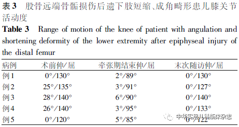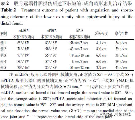 结果本组5例患儿,术后均获得随访,术后平均随访22个月(15~32个月),术后股骨平均延长5.6 cm(3.9~8.0 cm),平均愈合指数为35.6 d/cm(29.0~45.0 d/cm)。所有患儿肢体长度达到术前计划,股骨远端成角畸形矫正满意,下肢机械轴线恢复满意,mLDFA、mPDFA、机械轴偏移(MAD)均恢复至正常范围(表2),股骨远端截骨矫形处均在4个月内愈合,末次随访时X线片显示牵张区新生骨矿化及截骨断端愈合良好。所有患儿带架期间,屈膝活动度基本达到90°(表3),对下地行走、康复锻炼及日常生活无影响,至末次随访时,所有患儿膝关节活动正常。