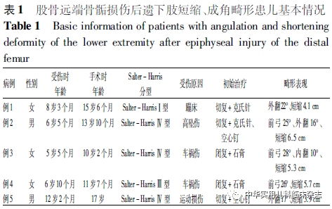 资料与方法1.1 临床资料 回顾性分析2017年5月至2019年12月郑州市骨科医院小儿骨科收治的5例股骨远端骨骺损伤后遗下肢短缩、成角畸形患儿资料,其中男2例、女3例,平均年龄13.6岁(10~17岁),均为单侧。术前患肢平均短缩5.1 cm(3.9~6.5 cm),股骨远端平均成角24.9°(17.0°~30.5°),2例为股骨远端外翻畸形,1例为股骨远端前弓畸形,1例为股骨远端内翻并前弓畸形,1例为股骨远端外翻并前弓畸形,见表1。本研究通过郑州市骨科医院医学伦理委员会批准[批准文号:郑州市骨科医院伦理委员会2017医院伦审第(013)号],患儿监护人术前均知情同意,并签署知情同意书。
