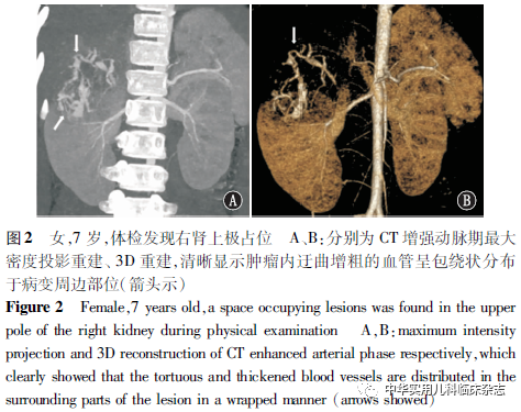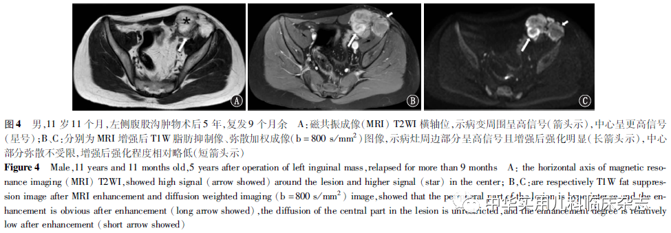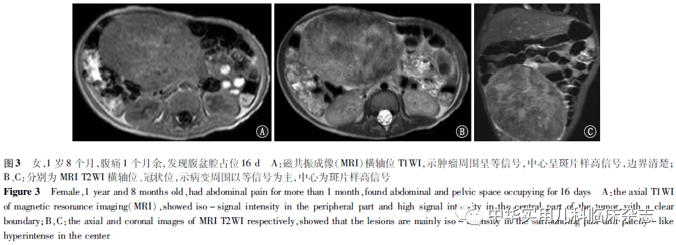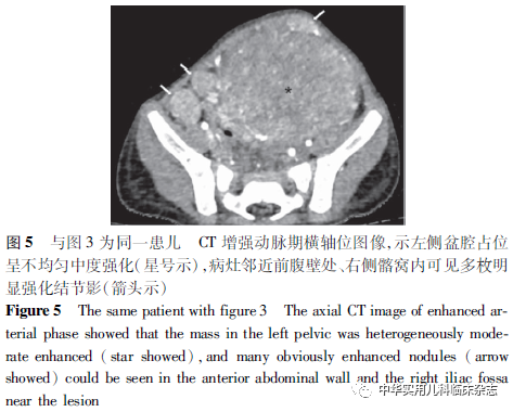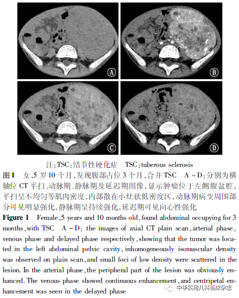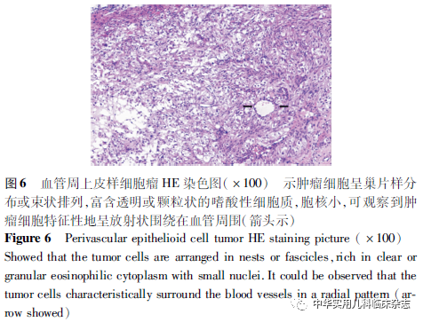 讨论大部分PEComa患者无特殊症状,恶心、消化不良、食欲减退和局部疼痛均有报道,无症状或体检偶然发现的病例也不少[4-5]。本组患儿中3例以疼痛、慢性消耗或局部压迫症状起病,1例患儿为外院“腹股沟区肿物”术后复发来诊,2例为体检发现。文献报道本病以围绝经期女性居多,多起源于子宫,也可发生于肝脏、胰腺、消化道、泌尿道、腹盆腔及腹膜后等部位[6-8]。本组病例绝大多数来源于腹盆腔及腹膜后(肾脏),虽无发生于子宫者,但仍以女性多见(男∶女=1∶2),可能为儿童发病的性别特点。既往文献显示本病成人病例实验室检查无明显特异性指标[9-10],但本研究发现5例患儿NSE不同程度升高(为42.7~148.8 μg/L),分析可能原因:(1)本组患儿术前影像检查均误诊为神经母细胞瘤、横纹肌肉瘤等儿童常见肿瘤,而NSE作为神经母细胞瘤的特异性肿瘤标志物属于本组病例的常规筛查项目,而成人病例可能由于未检测NSE水平而漏掉该信息;(2)由于肿瘤细胞内弥漫表达HMB45、Melan-A、S-100等黑色素细胞标志物,这与黑色素瘤(NSE升高)的表现存在重合,因此推断儿童PEComa可能与黑色素瘤类似,具有一定的神经内分泌分化潜能,而成人病例该潜能可能退化,目前该推论仍需进一步研究证实。通过本组病例总结发现,PEComa在CT或MRI上存在一些特征性表现。最常见表现为边界清楚的类椭圆形肿块,伴花边样或结节样边缘,增强后病变边界更清晰。肿瘤体积一般较大,平均长径为9.3 cm(4.8~15.9 cm),且以上下径为最大,考虑可能为肿瘤多位于腹盆腔内,不能早期触及发现,且腹盆腔内上下方向生长范围更宽松,1例腹股沟区病变体积最小,与其位置浅表易早期发现有关。本组病例多为恶性,具有一些局部侵袭性和远处转移的表现。2例腹腔内病灶中1例虽肿瘤本身未见周围侵犯,但临近的腹壁及右侧髂窝内可见多枚结节样病变,术后病理证实为转移灶,而另1例则直接侵犯包绕左肾,局部与大网膜黏连。2例发生于肾脏者中1例合并TSC者为良性,肿瘤仅有少许边缘模糊和肾周积液,未见临近侵犯和远处转移,另1例恶性者,其病变上缘与肝脏关系密切,但未行肿瘤切除,未能明确是否有肝脏受侵。1例病变位于子宫后方,与子宫、附件融为一体,术中难以分离遂将子宫和附件一同切除。1例腹股沟区病变为术后复发,可见肿瘤沿精索走形并延伸入盆腔,广泛侵犯腹壁肌层及盆腔肌群,包绕血管,并可见淋巴结转移。在增强CT图像中,PEComa常在动脉期表现出周边分布的明显强化,这表明PEComa是一种富血管性肿瘤,且供血微血管常围绕肿瘤周围存在,这一“周边强化”的影像学特征可能对PEComa的鉴别诊断很有价值[3,11]。由于病变内拥有多种不同的细胞成分,故多呈不均匀强化,5例肿瘤中心的低密度不强化区代表了瘤内的大面积坏死、液化部分,其中3例肿瘤切除后得到了病理证实。1例病变平扫密度较均匀,增强后仍以周边强化为主,中心区域轻度强化呈相对低密度区,可能与其平滑肌结构或其他少血管成分有关。对本组病例的CT动脉期图像进行最大密度投影(MIP)重建可清晰显示肿瘤内迂曲增粗的血管,可见5例 PEComa的血管分布于病变边缘,呈包绕状,这与大多数肿瘤血管常延伸至病变内有所不同。静脉期多数PEComa在静脉期呈持续强化,延迟期病变周围部分出现强化减低,1例病变出现类似“血管瘤”的向心性强化,更说明了该病变血供丰富。在MRI平扫图像上,本组肿瘤多数呈现出“内高外低”的信号特点:即T1WI上多数表现为中心高信号、周围等信号,T2WI上病灶周围呈等/高信号,中心呈高/更高信号,这可能与肿瘤中心部位的出血、坏死有关。高b值DWI上可见病灶周边部分弥散受限且增强后强化明显,中心部分弥散不受限,增强后不强化或仅轻微强化,这种“弥散与强化相对应”的表现可能提示肿瘤的外周部分肿瘤细胞排列密集或具有恶性潜能。1例腹壁及右髂窝多发结节灶、1例腹股沟区多发肿大淋巴结亦可见弥散受限及明显较均匀强化,提示为恶性转移。3例病变内均观察到迂曲流空血管影,多以周围分布为主。PEComa可伴发于TSC,也可单独发生[12]。本组中2例患儿合并TSC,可见皮肤、中枢神经系统、肝脏及心脏等其他系统TSC表现。当TSC患者发现肾脏或腹盆部占位,尤其不含明显脂肪成分或表现出侵袭性行为时,需考虑本病可能性大。光镜下PEComa 的肿瘤组织由变形的血管、上皮样或梭形平滑肌细胞构成,肿瘤细胞常呈巢片样或梁状分布。上皮样型细胞富含透明或颗粒状的嗜酸性细胞质,胞核较小,位于细胞中央,呈圆形并有小核仁。梭形细胞多为束状排列,含嗜酸性细胞质伴不同程度空泡变性。肿瘤内存在丰富的血管,肿瘤细胞常特征性地呈簇状或放射状排列在血管周围,导致管腔变形、扭曲,伴不同程度透明及淀粉样变性[1、13-14]。在免疫组织化学上PEComa常呈黑色素-肌肉双源性表达,本组中仅1例患儿不满足黑色素-肌肉双源性表达这一标准,但行基因检测后发现其存在TFE3基因位点断裂和包含Xp11.2在内的染色体异位,故诊断为Xp11/TFE3异位性PEComa,该病属于少见类型的PEComa,其侵袭性和转移性较普通PEComa更强,预后更差[15-16],也许这点可以解释为何影像学上该病灶并未表现出周围侵犯,却已经出现腹壁和髂窝多发转移灶的原因。本组病例术前影像几乎全部误诊为神经母细胞瘤、生殖细胞瘤、横纹肌肉瘤及肾母细胞瘤等,说明该病术前鉴别诊断确实难度