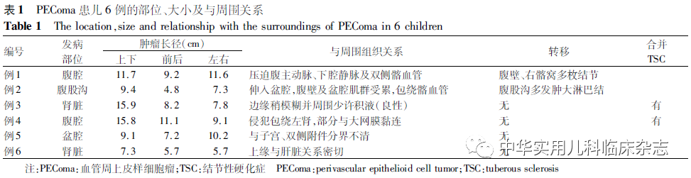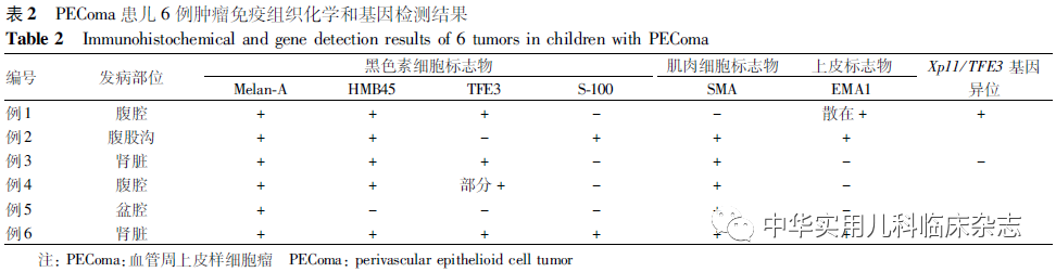 血管周上皮样细胞瘤(PEComa)是2002年世界卫生组织(WHO)肿瘤分类中出现的一个新分类。2013版WHO软组织与骨肿瘤分类中将其定义为“由血管周上皮样细胞(PEC)组成的间叶源性肿瘤”,常表达黑色素和平滑肌标志物[1-2]。过去认为“PEComa家族肿瘤”包括肾血管平滑肌脂肪瘤(AML)、淋巴管平滑肌瘤病(LAM)、肺透明细胞糖瘤(CCST)和非特殊类型PEComa(PEComa-NOS)[1]。2022版WHO软组织肿瘤分类中不再推荐使用“CCST”这一诊断术语,并取消了“家族肿瘤”的名称,重新界定了PEComa仅包括AML、LAM 和PEComa-NOS[1,3]。本研究是针对PEComa-NOS进行的总结归纳,AML和LAM并未包括在内。由于本病较罕见,发生于儿童者更少,本研究报道并总结了6例儿童PEComa的临床病理及影像学特征,以提高该病的诊断水平。